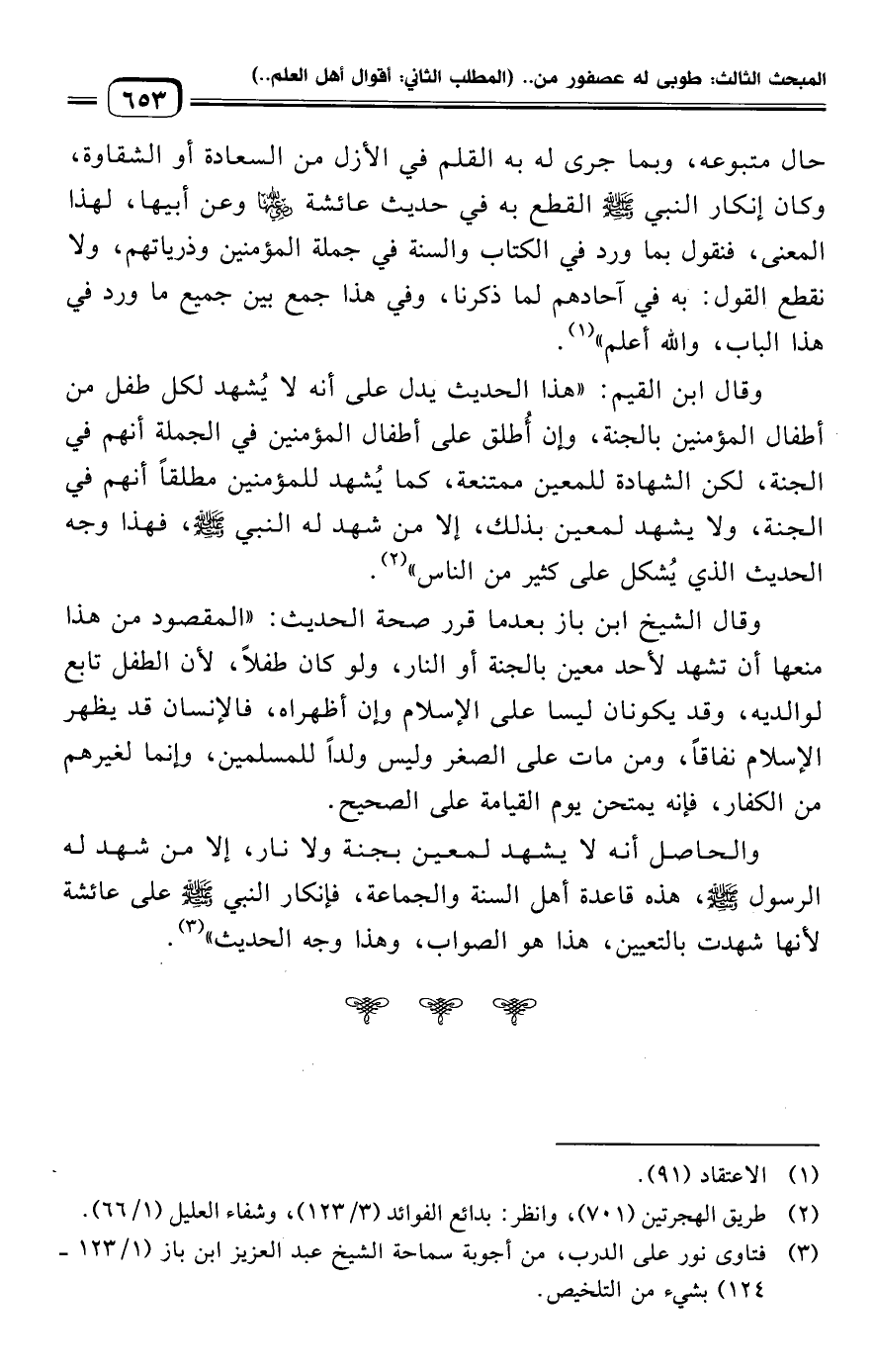 وقال ابن القيم: "هذا الحديث يدل على أنه لا يُشهد لكل طفل من أطفال المؤمنين بالجنة، وإن أُطلق على أطفال المؤمنين في الجملة أنهم في الجنة، لكن الشهادة للمعين ممتنعة، كما يُشهد للمؤمنين مطلقًا أنهم في الجنة، ولا يشهد لمعين بذلك، إلا من شهد له النبي -صلى الله عليه وسلم-، فهذا وجه الحديث الذي يُشكل على كثير من الناس" (¬٢).