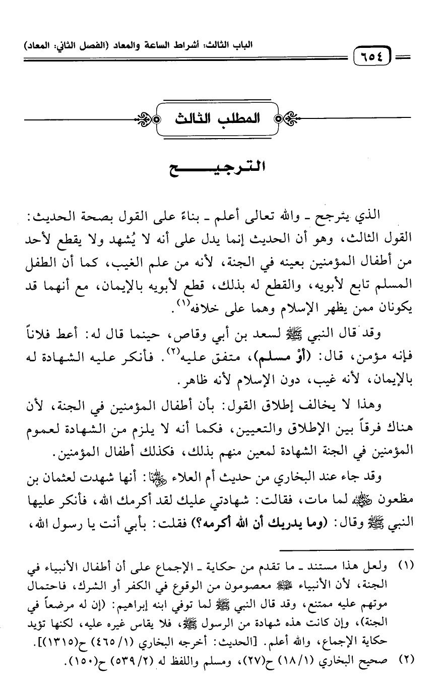 (¬١) ولعل هذا مستند -ما تقدم من حكاية- الإجماع على أن أطفال الأنبياء في الجنة، لأن الأنبياء -عليهم السلام- معصومون من الوقوع في الكفر أو الشرك، فاحتمال موتهم عليه ممتنع، وقد قال النبي -صلى الله عليه وسلم- لما توفي ابنه إبراهيم: (إن له مرضعًا في الجنة)، وإن كانت هذه شهادة من الرسول -صلى الله عليه وسلم-، فلا يقاس غيره عليه، لكنها تؤيد حكاية الإجماع، والله أعلم. [الحديث: أخرجه البخاري (١/ ٤٦٥) ح (١٣١٥)].
