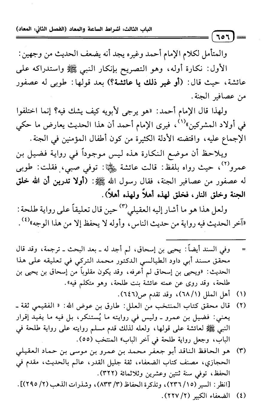 (¬٢) قال محقق كتاب المنتخب من العلل: طارق بن عوض الله: "الفقيمي ثقة -يعني: فضيل بن عمرو- وليس في روايته ما يُستنكر، بل فيه ما يفيد إقرار النبي -صلى الله عليه وسلم- لعائشة على قولها، ولعله لذلك قدم مسلم روايته على رواية طلحة في الباب، وجعل رواية طلحة في آخر الباب" المنتخب (٥٥).