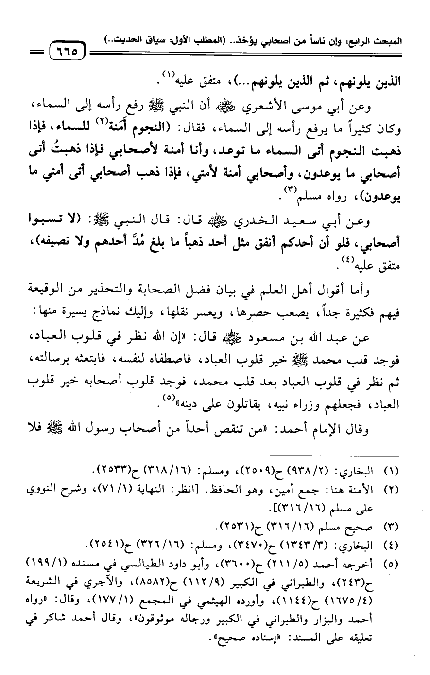 وعن أبي سعيد الخدري -رضي الله عنه- قال: قال النبي -صلى الله عليه وسلم-: (لا تسبوا أصحابي، فلو أن أحدكم أنفق مثل أحد ذهبًا ما بلغ مُدَّ أحدهم ولا نصيفه)، متفق عليه (¬٤).