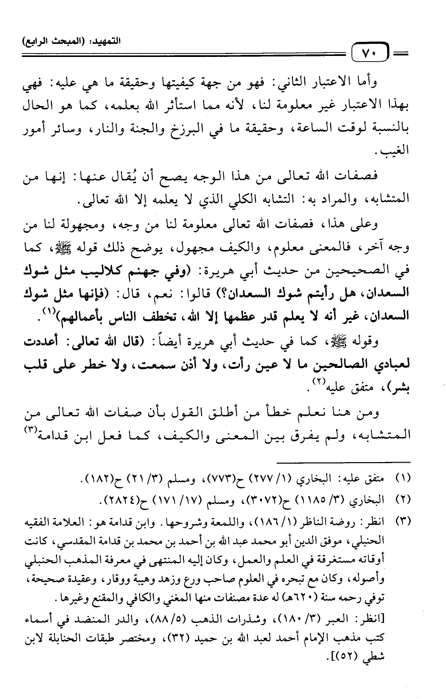 ومن هنا نعلم خطأ من أطلق القول بأن صفات الله تعالى من المتشابه، ولم يفرق بين المعنى والكيف، كما فعل ابن قدامة (¬٣)