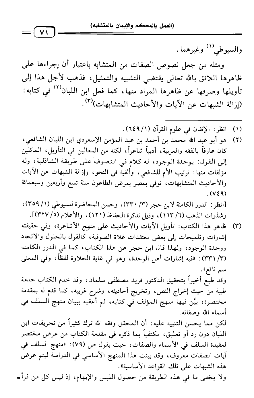 لكن مما يحسن التنبيه عليه: أن المحقق وفقه الله ترك كثيرًا من تحريفات ابن اللبان دون رد أو تعليق، مكتفيًا بما ذكره في مقدمة الكتاب من عرض مختصر لعقيدة السلف في الأسماء والصفات، حيث يقول ص (٧٩): "منهج السلف في آيات الصفات معروف، وقد بينت هذا المنهج الأساسي في الدراسة ليتم عرض هذه الشبهات على تلك القواعد الأساسية".