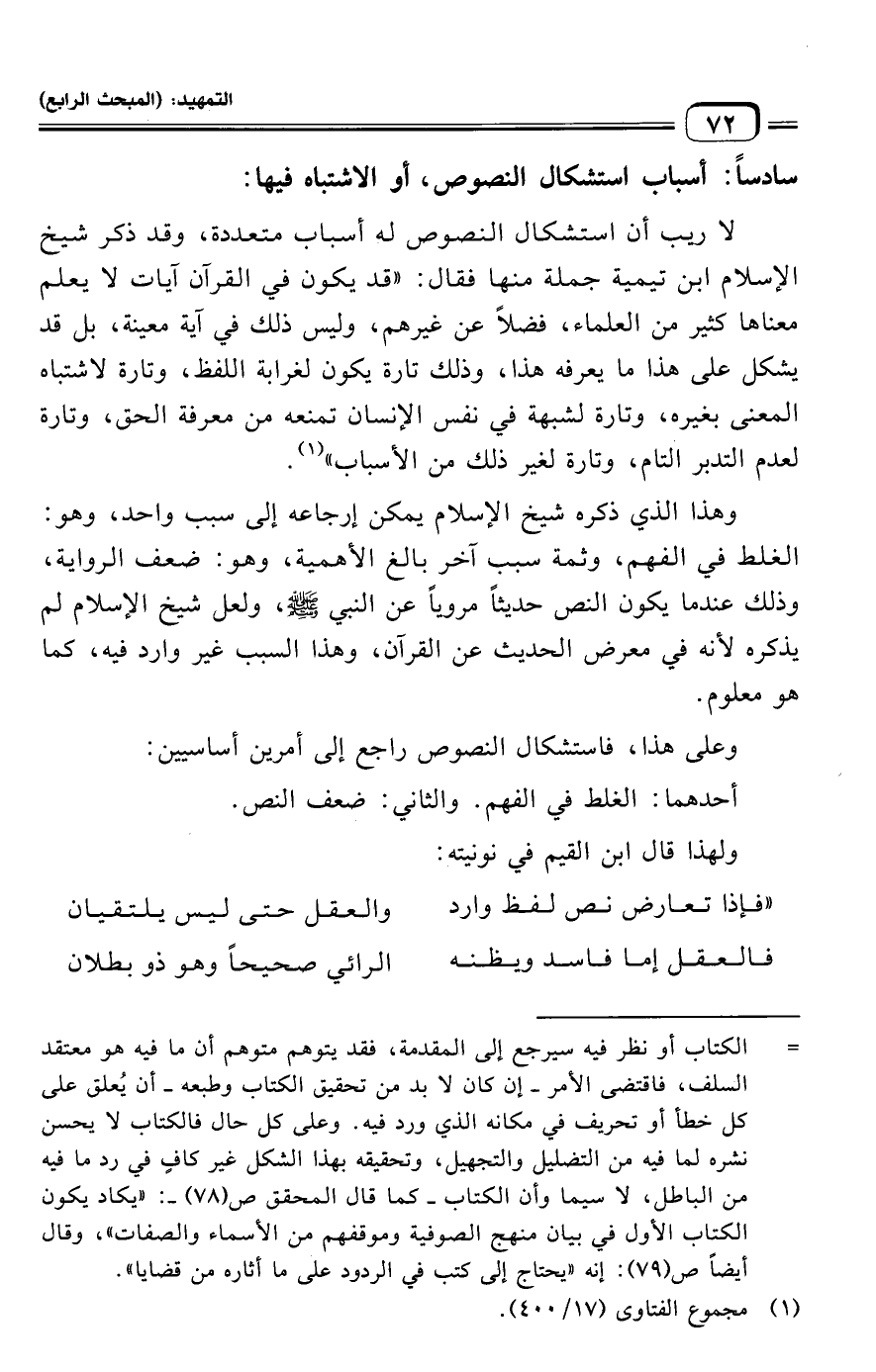 وهذا الذي ذكره شيخ الإسلام يمكن إرجاعه إلى سبب واحد، وهو: الغلط في الفهم، وثمة سبب آخر بالغ الأهمية، وهو: ضعف الرواية، وذلك عندما يكون النص حديثًا مرويًا عن النبي -صلى الله عليه وسلم-، ولعل شيخ الإسلام لم يذكره لأنه في معرض الحديث عن القرآن، وهذا السبب غير وارد فيه، كما هو معلوم.