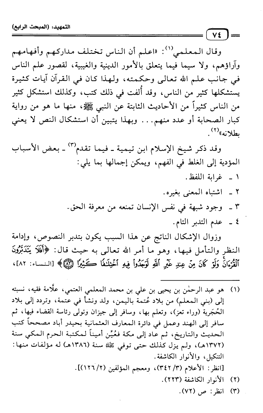 (¬١) هو عبد الرحمن بن يحيى بن علي بن محمد المعلمي العتمي، علَّامة فقيه، نسبته إلى (بني المعلم) من بلاد عُتمة باليمن، ولد ونشأ في عتمة، وتردد إلى بلاد الحُجَرية (وراء تعز)، وتعلم بها، وسافر إلى جيزان وتولى رئاسة القضاء فيها، ثم سافر إلى الهند وعمل في دائرة المعارف العثمانية بحيدر أباد مصححًا كتب الحديث والتاريخ، ثم عاد إلى مكة فعُيِّن أمينًا لمكتبة الحرم المكي سنة (١٣٧٢ هـ)، ولم يزل كذلك حتى توفي رَحِمَهُ اللهُ سنة (١٣٨٦ هـ) له مؤلفات منها: التنكيل، والأنوار الكاشفة. [انظر: الأعلام (٣/ ٣٤٢)، ومعجم المؤلفين (٢/ ١٢٦)].