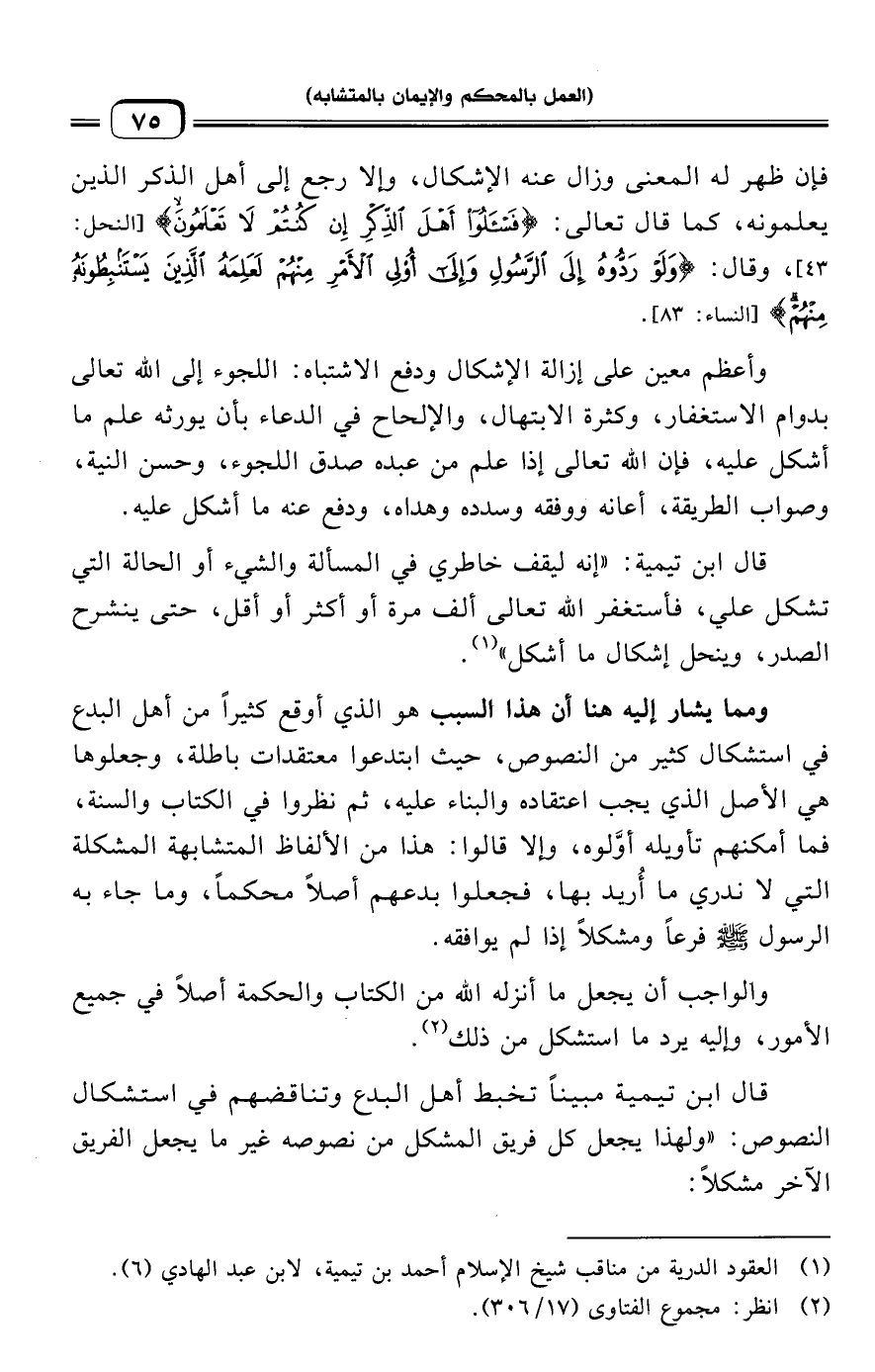 فإن ظهر له المعنى وزال عنه الإشكال، وإلا رجع إلى أهل الذكر الذين يعلمونه، كما قال تعالى: {فَاسْأَلُوا أَهْلَ الذِّكْرِ إِنْ كُنْتُمْ لَا تَعْلَمُونَ} [النحل: ٤٣]، وقال: {وَلَوْ رَدُّوهُ إِلَى الرَّسُولِ وَإِلَى أُولِي الْأَمْرِ مِنْهُمْ لَعَلِمَهُ الَّذِينَ يَسْتَنْبِطُونَهُ مِنْهُمْ} [النساء: ٨٣].