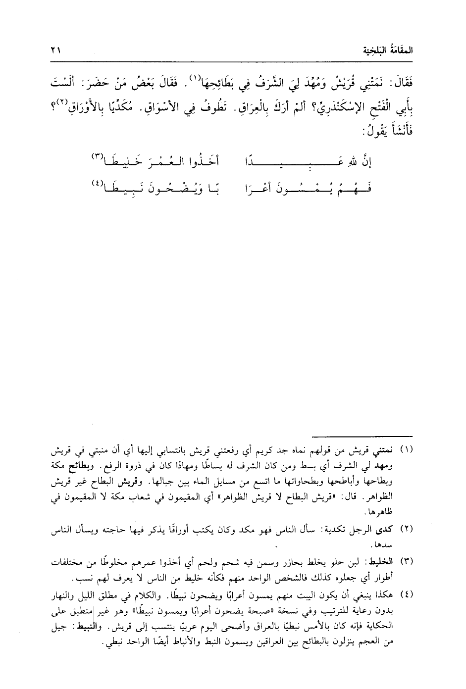 فَقَالَ : نَمَتْنِي قُرَيشٌ وَمُهِّدَ لِيَ الشَّرفُ فِي بَطَائِحِهَا ، فَقالَ بَعْضُ مَنْ حَضَرَ : أَلَسْتَ بِأَبِي الْفَتْحِ الإْسْكَنْدَريِ ? أَلَمْ أَرَكَ بِالْعِراقِ ، تَطُوفُ فِي الأَسْواقِ ، مُكَدِّياً بِالأَوْرَاقِ ? فَأَنْشِأَ يَقُولُ :