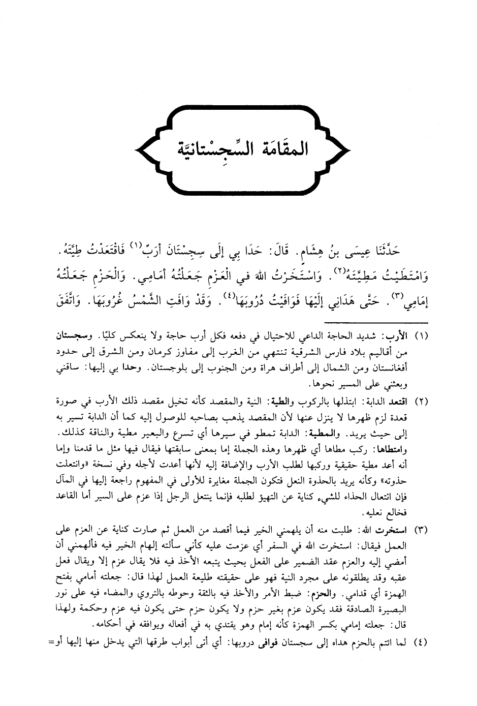 حَدا بِي إِلى سِجِسْتَانَ أَرَبٌ، فَاقْتَعَدْتُ طِيَتَّهُ، وَامْتَطَيْتُ مَطِيَّتَهُ، وَاسْتَخَرْتُ الله فِي العَزْمِ جَعَلْتُهُ أَمَامِي، وَالْحَزْمِ جَعَلْتُهُ إِمَامِي حَتَّى هَدَانِي إِلَيْهَا، فَوَافَيْتُ دُرُوبَهَا وَقَدْ وَافَتِ الشَّمْسُ غُرُوبَهَا، وَاتَّفَقَ