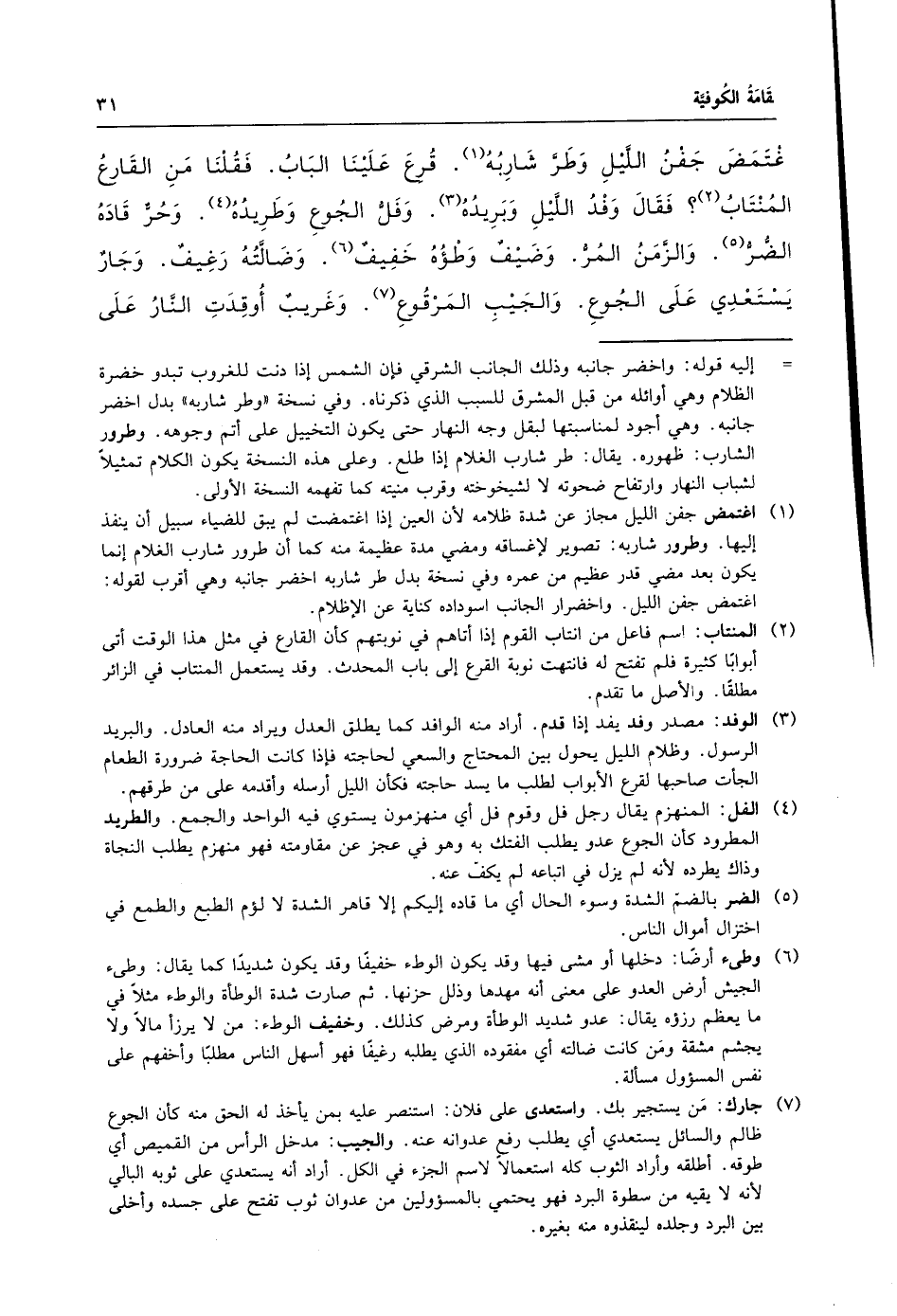 اغْتَمَضَ جَفْنُ اللَّيْلِْ وَطَرَّ شَارِبُهُ ، قُرِعَ عَلَيْنا البابُ ، فَقُلْنا : مَنِ القارِعُ المُنْتابُ ? فقالَ : وَفْدُ اللَّيْلِ وَبَريدُهُ ، وَفَلُّ الجُوعِ وَطَريدُهُ ، وَحُرُّ قَادَهُ الضُّرُّ ، والزَّمَنُ المُرُّ ، وَضَيْفٌ وَطْؤُهَ خَفيفٌ ، وَضَالَّتُهُ رَغيفٌ ، وَجَارٌ يَسْتَعْدِى عَلى الجُوعِ ، وَالجْيبِ المَرْقُوعِ ، وَغَرِيبٌ أَوقِدَتِ النَّارُ عَلى