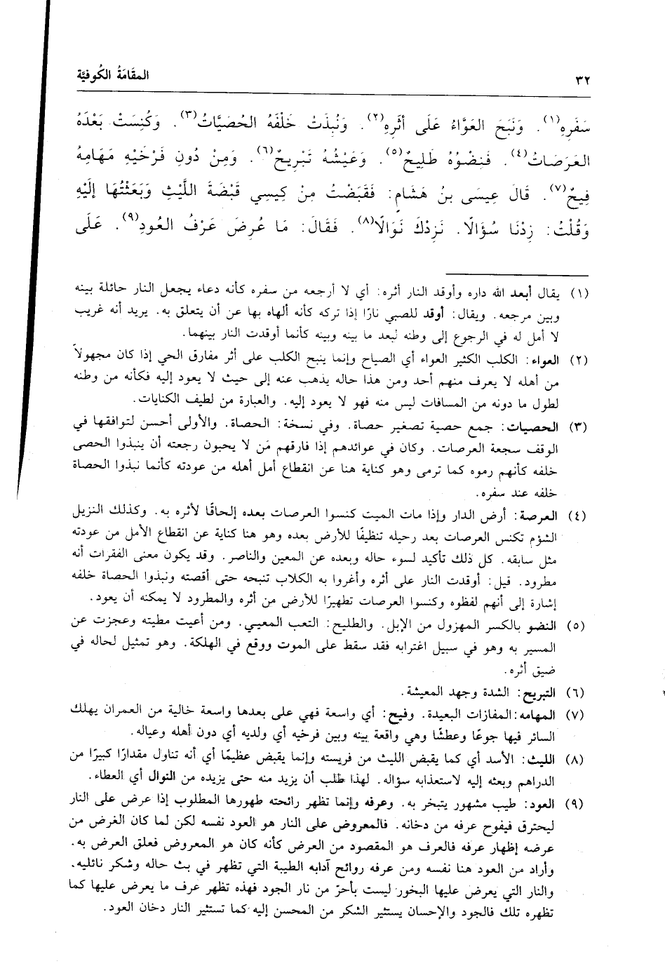 سَفَرِهِ ، وَنَبَحَ العَوَّاءُ عَلَى أَثَرِهِ ، وَنُبِذَتْ خَلْفَهُ الحُصَيَّاتُ ، وَكُنِسَتْ بَعْدَهُ العَرَصاتُ ، فَنِضْوُهُ طَليحٌ ، وَعَيْشُهُ تَبْريحٌ ، وَمِنَ دُونِ فَرْخَيْهِ مَهَامِهُ فِيحٌ .