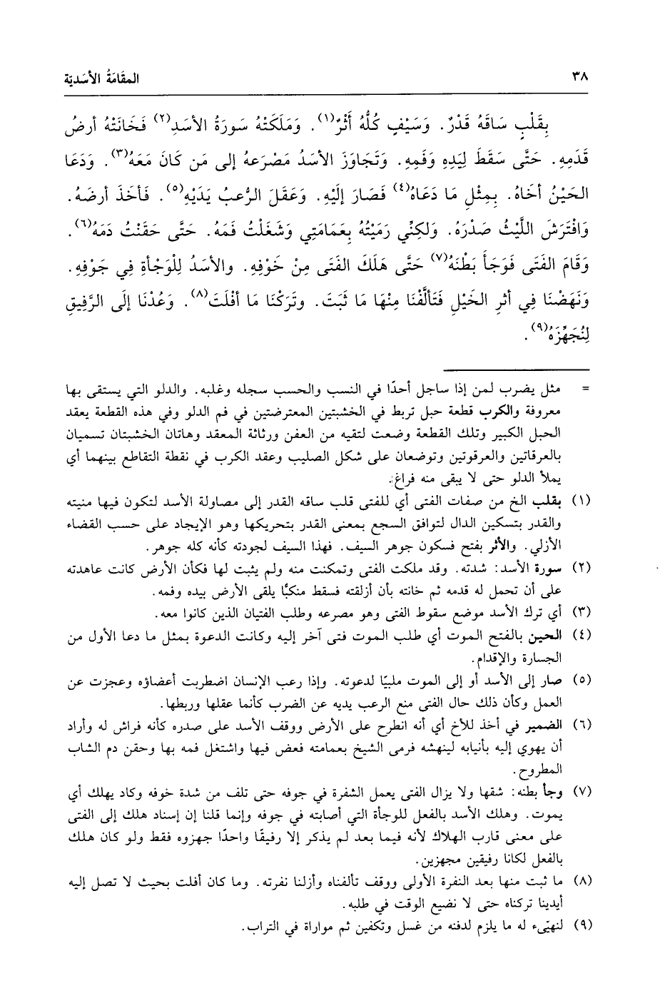 بِقَلْبٍ سَاقَهُ قَدْرٌ ، وَسَيْفٍ كُلُّهُ أَثْرٌ ، وَمَلَكَتْهُ سَوْرَةُ الأَسَدِ فَخَانَتْهُ أَرْضُ قَدَمِهِ ، حَتَّى سَقَطَ لِيَدِهِ وَفَمِهِ ، وَتَجَاوَزَ الأَسَدُ مَصْرَعَهُ ، إِلَى مَنْ كَانَ مَعَهُ ، وَدَعَا الْحَيْنَ أَخَاهُ ، بِمِثْلِ مَا دَعَاهُ ، فَصارَ إِلَيْهِ ، وَعَقَلَ الرُّعْبُ يَدَيهِ ، فَأَخَذَ أَرْضَهُ ، وَافْتَرشَ اللَّيثُ صَدْرَهُ ، وَلَكِّنْي رَمَيْتُهُ بِعِمَامَتِي ، وَشَغلتُ فَمَهُ ، حَتَّى حَقَنْتُ دَمَهُ ، وَقَامَ الفَتَى فَوَجَأَ بَطْنَهُ ، حتَّى هَلَكَ الفَتَى مِنْ خَوْفِهِ ، والأَسَدُ لِلْوَجْأَةِ في جَوفِهِ ، ونَهَضْنا فِي أَثَرِ الخَيْلِ فَتَأَلَّفْنا مِنْهَا ما ثَبَتَ ، وَتَرَكْنَا مَا أَفْلَتَ ، َوعُدْنَا إِلى الرَّفِيقِ لِنُجَهِّزَهُ