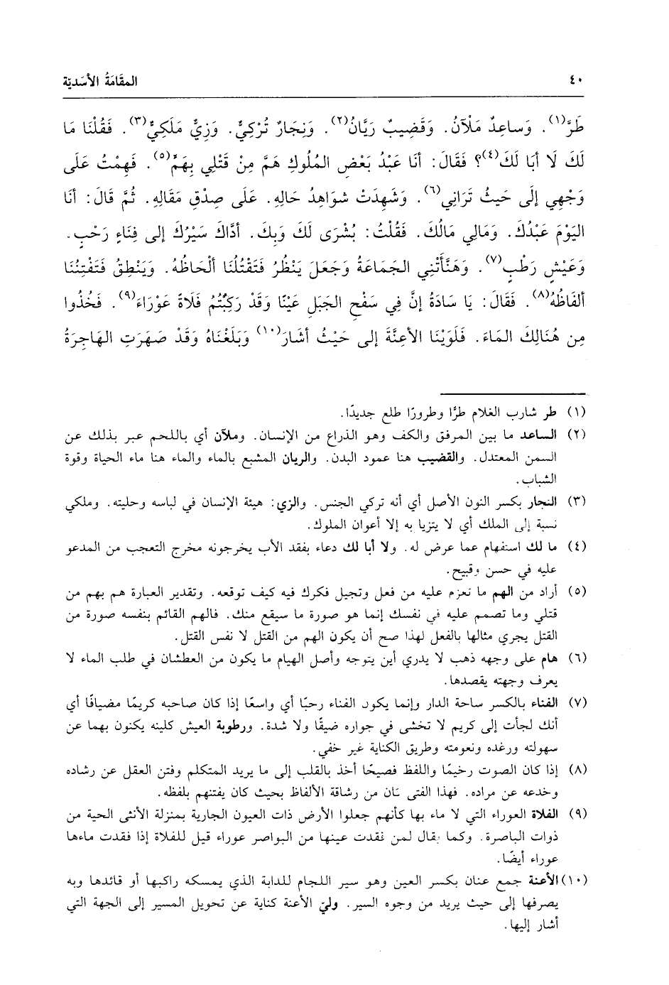 طَرًّ ، وَسَاعِدٌ مَلآنٌ ، وَقَضِيبٌ رَيَّانُ ، ونِجَارٌ تُرْكِيٌ ، وَزِيٌ مَلَكِيٌ ، فَقُلْنَا : مَالَكَ لاَ أَبَالكَ ? فَقَالَ : أَنَا عَبْدُ بَعْضِ الْمُلوكِ ، هَمَّ مِنْ قَتْلي بِهَمٍّ ، فَهِمْتُ عَلى وَجْهِي إِلى حَيْثُ تَرانِي ، وَشَهِدَتْ شَوَاهِدُ حالهِ ، على صِدْقِ مَقَالِهِ ، ثُمَّ قَالَ : أَنَا اليَومَ عَبْدُكَ ، وَمَالِي مَالُكَ ، فَقُلْتُ : بُشْرَى لَكَ وَبِكَ ، أَدَّاكَ سَيْرُكَ إِلَى فِنَاءٍ رَحْبٍ ، وَعَيْشٍ رَطْبٍ ، وَهَنْأَتْنِي الْجَمَاعَةُ ، وَجَعَلَ ينْظُرُ فَتَقْتُلَنَا أَلْحَاظَهُ ، وَيَنْطِقُ فَتَفْتِنٌنَا أَلْفَاظَهُ ، فَقَالَ : يَا سَادَةُ إِنَّ فِي سَفْحِ الجَبَلِ عَيْنَاً ، وَقَدْ رَكِبْتُمْ فُلاَةً عَوْرَاءَ ، فَخُذُوا مِنْ هُنَالِكَ الْمَاءَ ، فَلَوَيْنَا الأَعِنَةَ إِلى حَيثُ أشَارَ ، وَبَلَغْنَاهُ وَقَدْ صَهَرَتِ الهَاجِرَةُ