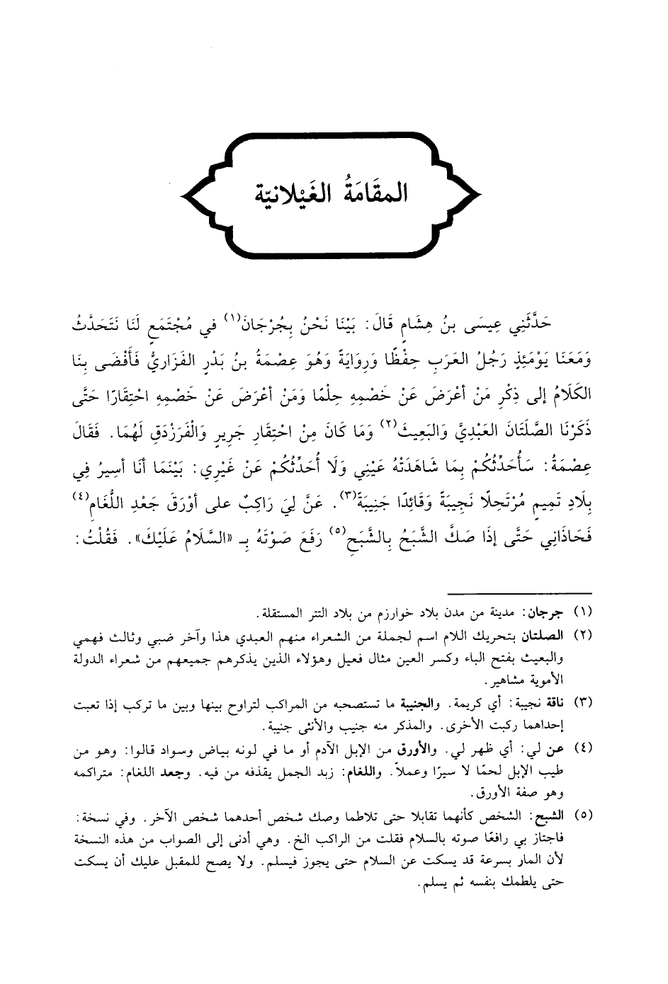 بَيْنَا نَحْنُ بِجُرْجَانَ، فِي مُجْتَمَعٍ لنَا نَتَحَدَّثُ، وَمَعَنَا يَوْمَئِذٍ رَجُلُ العَرَبِ حِفْظاُ وَرِوَايةً، وَهَوَ عِصْمَةُ بْنُ بَدْرٍ الفَزَارِيُّ، فأَفْضَى بِنَا الكَلاَمُ إِلَى ذِكْرِ مَنْ أَعْرَضَ عَنْ خَصْمِهِ حِلْماً، وِمِنْ أَعْرَضَ عَنْ خَصْمِهِ احْتِقَاراً، حَتَّى ذَكَرْنَا الصَّلَتَانَ الْعَبْدِيَّ وَالبَيِثَ، وَمَا كَانَ مِنْ احْتِقَارِ جَريرٍ وَالفَرَزْدَقِ لَهُمَا، فَقَالَ عِصْمَةُ: سَأُحَدِثَكُم بِمَا شَاهَدَتْهُ عَيْني، وَلاَ أُحَدِّثُكُمْ عَنْ غَيْري، بَيْنَمَا أَنَا أَسِيرُ فِي بِلادِ تَمِيمٍ مُرْتَحِلاً نَجِيَبةً، وَقائِداً جَنِيبَةً، عنَّ ليَ رَاكِبٌ عَلىَ أَوْرَقٍ جَعْدِ اللُّغَامِ، فَحَاذَانِي حَتَّى إِذا صَكَّ الشَّبَحُ بِالشَّبَحِ رَفَعَ صَوْتَهُ بِالسَّلامُ عَلَيْكَ، فَقُلْتُ: