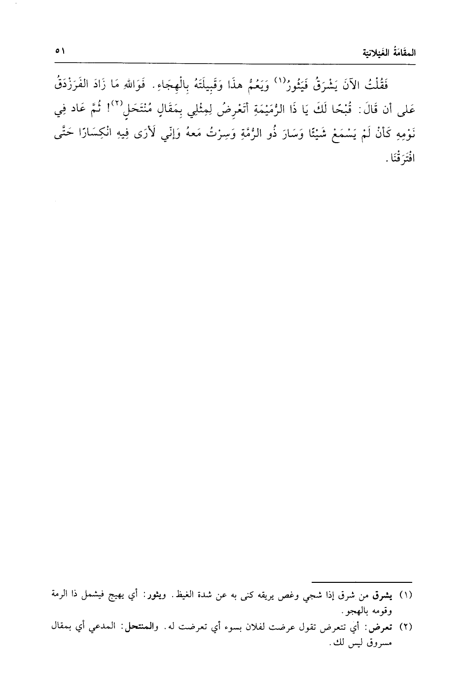 فَقُلْتُ : الآنَ يَشْرَقُ فَيَثُورُ ، وَيَعُمُّ هذا وَقبِيلَتُهُ بِالهِجَاءِ ، فَوَاللهِ مَا زَادَ الفَرَزْدَقُ عَلى أَنْ قَالَ : قُبْحَاً لكَ يا ذَا الرُّمَيْمَةِ أَتَعْرِضُ لِمِثْلي بِمَقالٍ مُنْتَحَلٍ ? ثُمَّ عَادَ فِي نَوْمِهِ كَأَنْ لَمْ يَسْمَعْ شَيْئاً ، وَسَارَ ذُو الرُّمَّةِ وَسِرْتُ مَعَهُ ، وَإِنِّي لأَرَى فِيهِ انْكِسَاراً حَتَّى افْتَرَقْنَا .