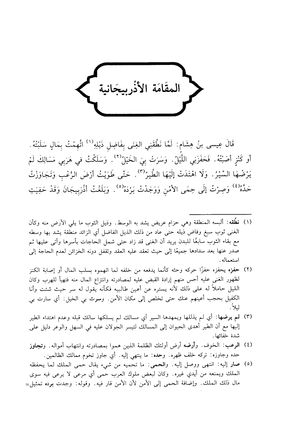 قَالَ عِيسَى بْنُ هِشَامٍ: لَمَّا نَطَّقَنِي الْغِنَى بِفَاضِلِ ذَيْلِهِ، اتُّهِمتُ بِمَالٍ سلَبْتُهُ، أَو كَنْزٍ أَصَبْتُهُ، فَحَفَزَنيِ اللَّيْلُ، وَسَرَتْ بِي الخَيْلُ، وَسَلكتُ فِي هَرَبِي مَسَالِكَ لَمْ يَرُضْهَا السَّيْرُ، وَلاَ اهْتَدَتْ إِلَيْهَا الطَّيْرُ، حَتَّى طَوَيْتُ أَرْضَ الرُّعْبِ وَتَجاوَزْتُ حَدَّهُ، وَصِرْتُ إِلى حِمَى الأَمْنِ َوَوجَدْتُ بَرْدَهُ، وَبَلَغْتُ أَذْرَبِيجَانَ وقَدْ حَفِيَتِ