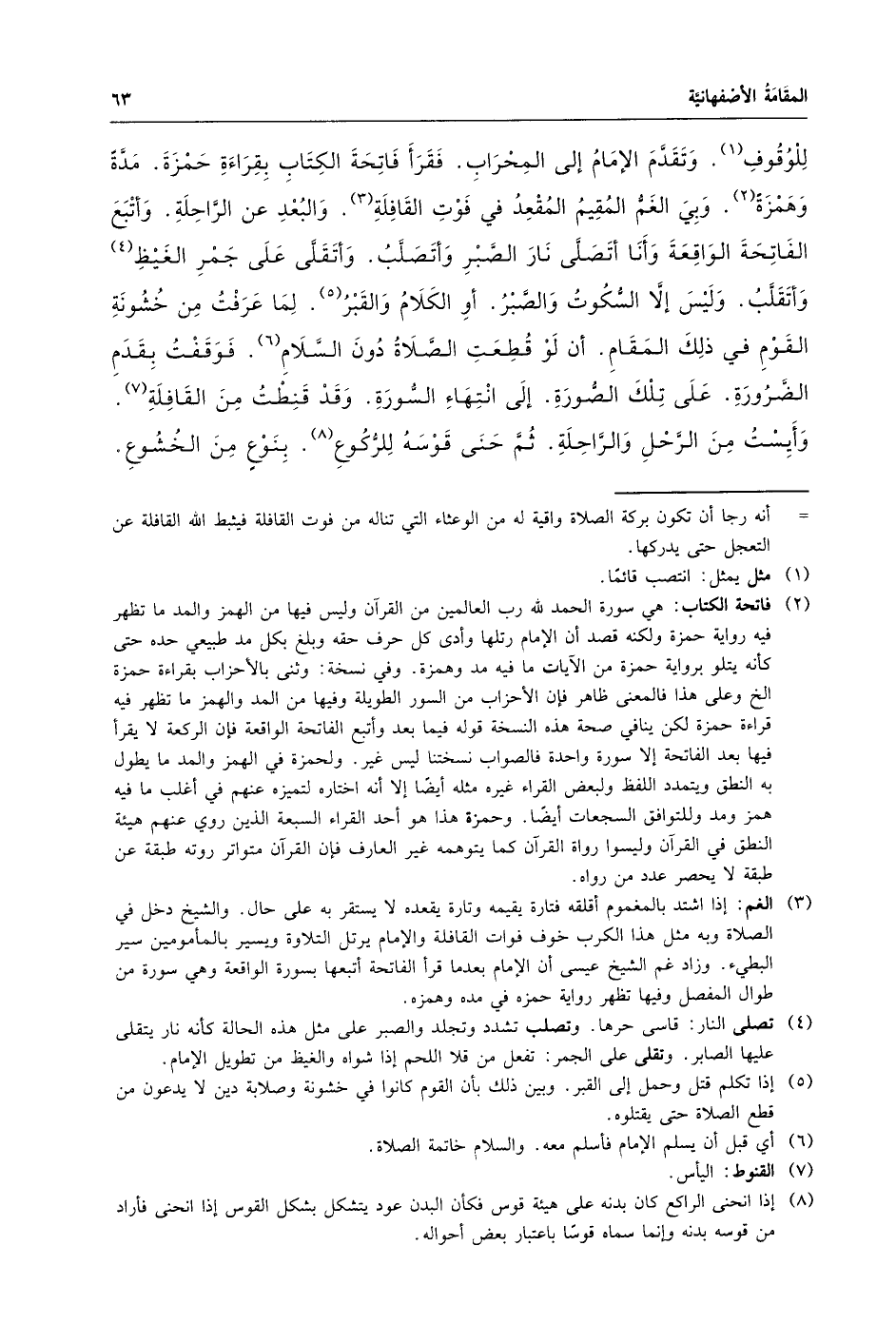 لِلْوُقُوفِ ، وَتَقَدَّمَ الإِمَاُم إِلى المِحْرَابِ ، فَقَرَأَ فَاتِحَةَ الكتَابِ ، بِقِراءَةِ حَمْزَةَ ، مَدَّةً وَهَمْزَةً ، وَبِي الْغَمُّ الْمُقِيمُ الْمُقْعِدُ في فَوْتِ القَافِلَةِ ، وَالبُعْدِ عَنِ الرَّاحِلَةِ ، وَاتْبَعَ الفَاتِحَةَ الوَاقِعَةَ ، وَأَنَا أَتَصَلَّى نَارَ الصَّبْرِ وَأَتَصَلَّبُ ، وَأَتَقَلَّى عَلى جَمْرِ الغَيْظِ وأَتَقَلَّبُ ، َوَلْيَس إِلاَّ السُّكُوتُ وَالصَّبْرُ ، أَوِ الكَلاَمُ وَالْقَبْرُ ؛ لِمَا عَرَفْتُ مِنْ خُشُونَةِ القَومِ فِي ذَلكَ المَقامِ ، أَنْ لَوْ قُطِعًتِ الصَّلاةُ دُونَ السَّلام ، فَوَقَفْتُ بِقَدَمِ الضَّرُورَةِ ، على تِلْكَ الصُّورَةِ إِلَى انْتِهَاءِ السُّورَةِ ، وَقَدْ قَنِطْتُ مِنَ القَافِلَةِ ، وَأِيِسْتُ مِنَ الرَّحْلِ وَالرَّاحِلَةِ ، ثُمَّ حَنَى قَوْسَهُ لِلْرُّكُوع ، بِنَوْعِ مِنَ الخُشُوعِ ،