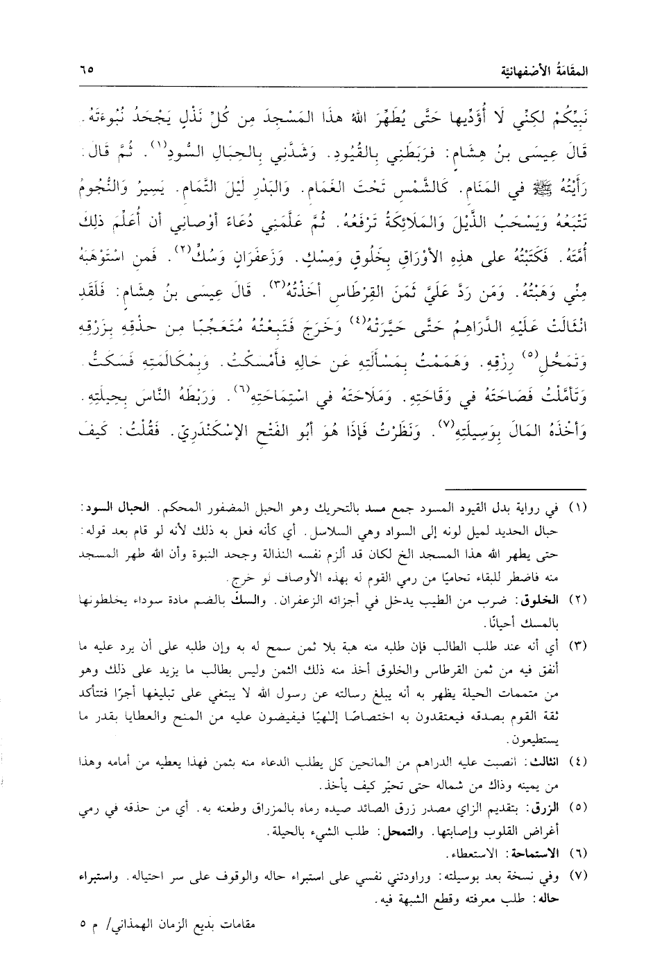 قَالَ عِيسَى بْنُ هِشَامٍ : فَرَبَطني بِالْقُيُودِ ، وَشَدَّني بِالحِبَالِ السُّودِ ، ثُمَّ قَالَ : رأَيْتُهُ صَلَّى اللهُ عَلَيْهِ وَسَلَّمَ فِي المَنَامِ ، كالشَّمْسِ تَحْتَ الغَمامِ ، وَالبَدْرِ لَيْلَ التَّمَامِ ، يَسِيرُ وَالنُّجُومُ تتَبْعَهُ ، ويَسْحَبُ الذَّيْلَ والمَلائِكَةُ تَرْفَعُهُ ، ثمَّ علَمَني دُعَاءً أَوْصَانِي أَنْ أُعَلِّمَ ذَلِك أُمَّتَهُ ، فَكَتَبْتُهُ عَلَى هذِهِ الأَوْرَاق بِخَلُوقٍ وَمِسْكٍ ، وَزَعْفَرَانٍ وَسُكٍ ، فَمَنِ اسْتَوْهَبَهُ مِنيِّ وَهَبْتُهُ ، وَمَنْ رَدَّ عَلَيَّ ثَمَنَ القِرْطَاسِ أَخَذْتُهُ .