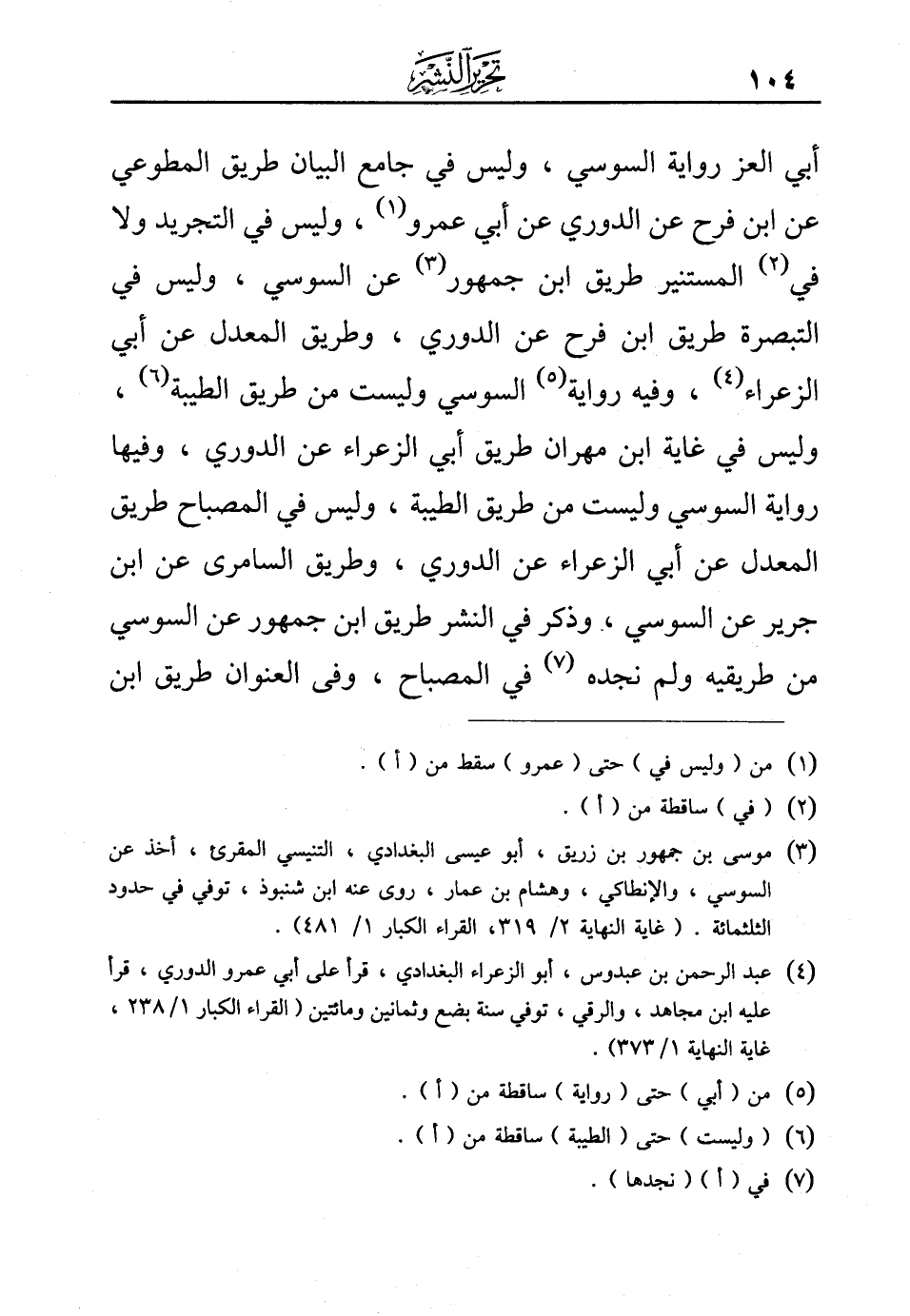 أبي العز رواية السوسي، وليس في جامع البيان طريق المطوعي عن ابن فرح عن الدوري عن أبي عمرو (¬1)، وليس في التجريد ولا في (¬2) المستنير طريق ابن جمهور (¬3) عن السوسي، وليس في التبصرة طريق ابن فرح عن الدوري، وطريق المعدل عن أبي الزعراء (¬4)، وفيه رواية (¬5) السوسي وليست من طريق الطيبة (¬6)، وليس في غاية ابن مهران طريق أبي الزعراء عن الدوري، وفيها رواية السوسي وليست من طريق الطيبة، وليس في المصباح طريق المعدل عن أبي الزعراء عن الدوري، وطريق السامرى عن ابن جرير عن السوسي، وذكر في النشر طريق ابن جمهور عن السوسي من طريقيه ولم نجده (¬7) في المصباح، وفى العنوان طريق ابن