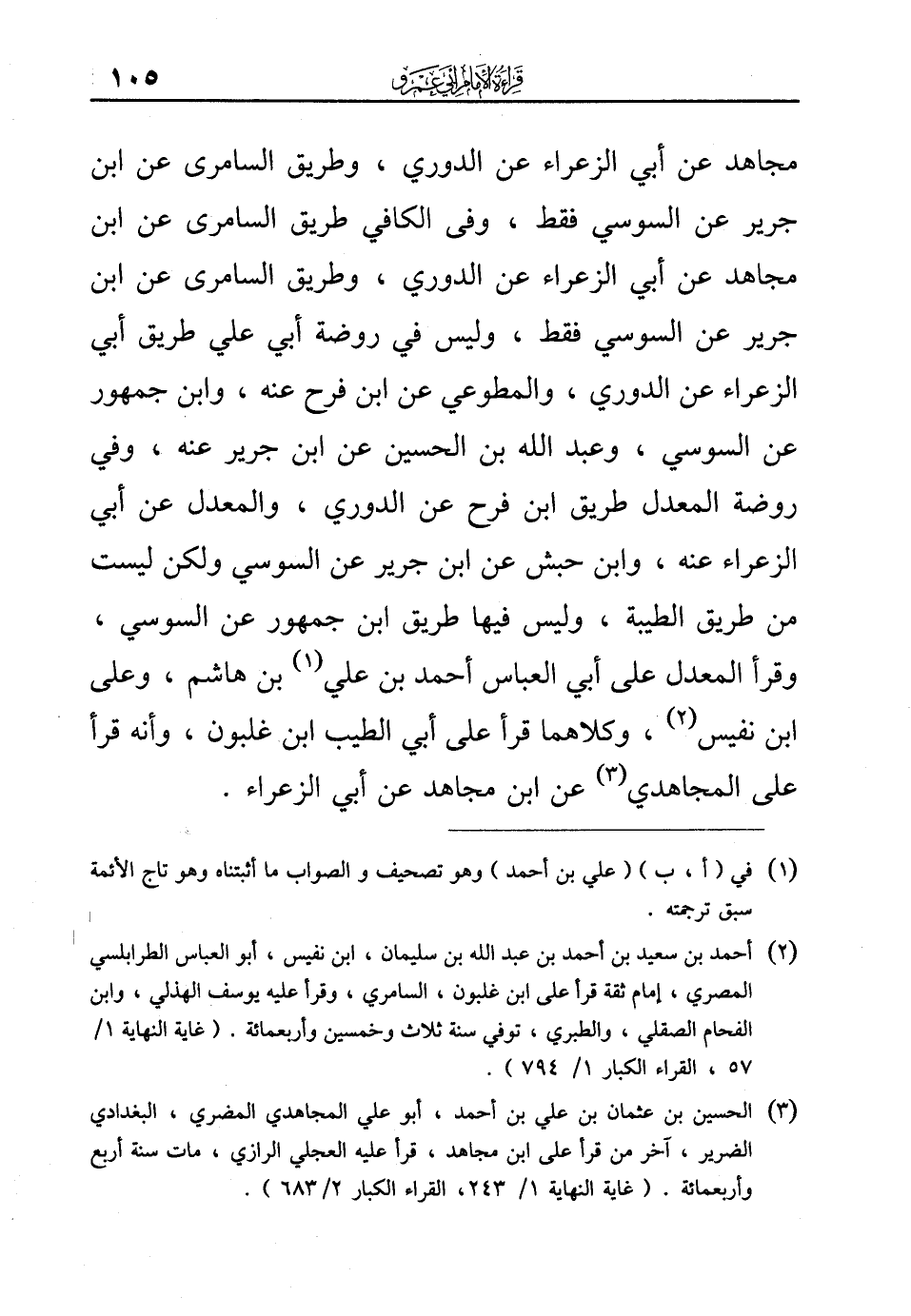مجاهد عن أبي الزعراء عن الدوري، وطريق السامرى عن ابن جرير عن السوسي فقط، وفى الكافي طريق السامرى عن ابن مجاهد عن أبي الزعراء عن الدوري، وطريق السامرى عن ابن جرير عن السوسي فقط، وليس في روضة أبي علي طريق أبي الزعراء عن الدوري، والمطوعي عن ابن فرح عنه، وابن جمهور عن السوسي، وعبد الله بن الحسين عن ابن جرير عنه، وفي روضة المعدل طريق ابن فرح عن الدوري، والمعدل عن أبي الزعراء عنه، وابن حبش عن ابن جرير عن السوسي ولكن ليست من طريق الطيبة، وليس فيها طريق ابن جمهور عن السوسي، وقرأ المعدل على أبي العباس أحمد بن علي (¬1) بن هاشم، وعلى ابن نفيس (¬2)، وكلاهما قرأ على أبي الطيب ابن غلبون، وأنه قرأ على المجاهدي (¬3) عن ابن مجاهد عن أبي الزعراء.