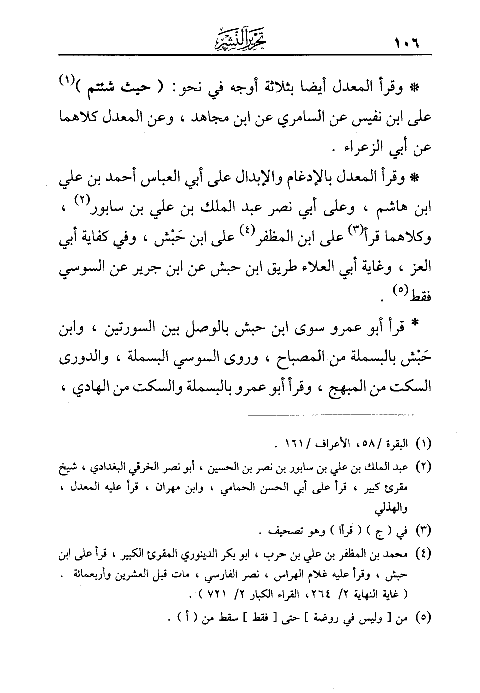 *وقرأ المعدل بالإدغام والإبدال على أبي العباس أحمد بن علي ابن هاشم، وعلى أبي نصر عبد الملك بن علي بن سابور (¬2)، وكلاهما قرأ (¬3) على ابن المظفر (¬4) على ابن حبش، وفي كفاية أبي العز، وغاية أبي العلاء طريق ابن حبش عن ابن جرير عن السوسي فقط (¬5).