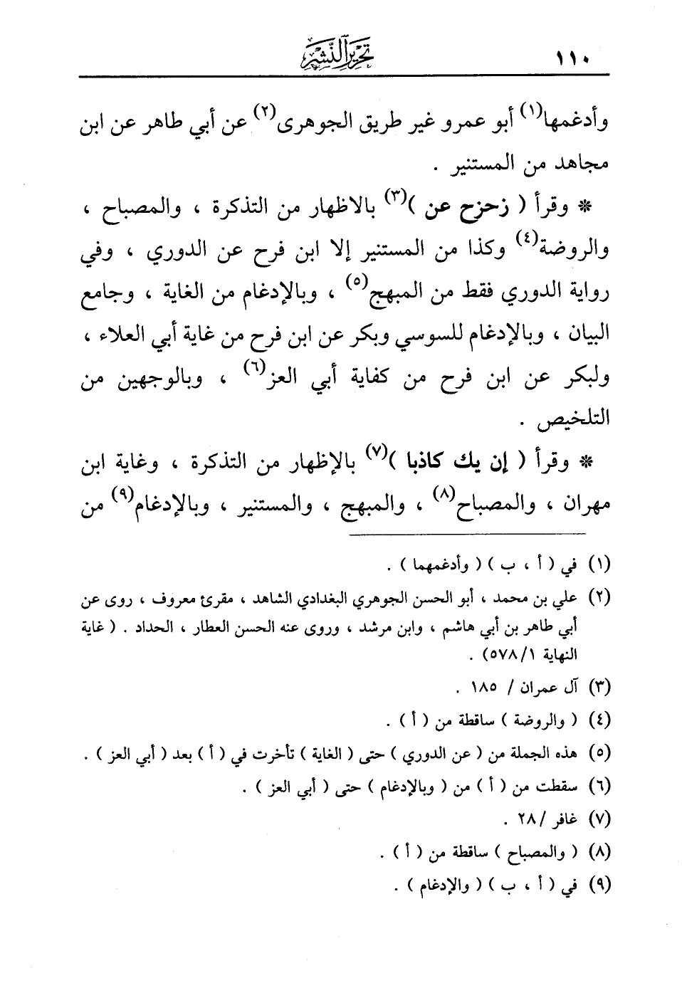 *وقرأ {(زُحْزِحَ عَنِ)} (¬3) بالاظهار من التذكرة، والمصباح، والروضة (¬4) وكذا من المستنير إلا ابن فرح عن الدوري، وفي رواية الدوري فقط من المبهج (¬5)، وبالإدغام من الغاية، وجامع البيان، وبالإدغام للسوسي وبكر عن ابن فرح من غاية أبي العلاء، ولبكر عن ابن فرح من كفاية أبي العز (¬6)، وبالوجهين من التلخيص.