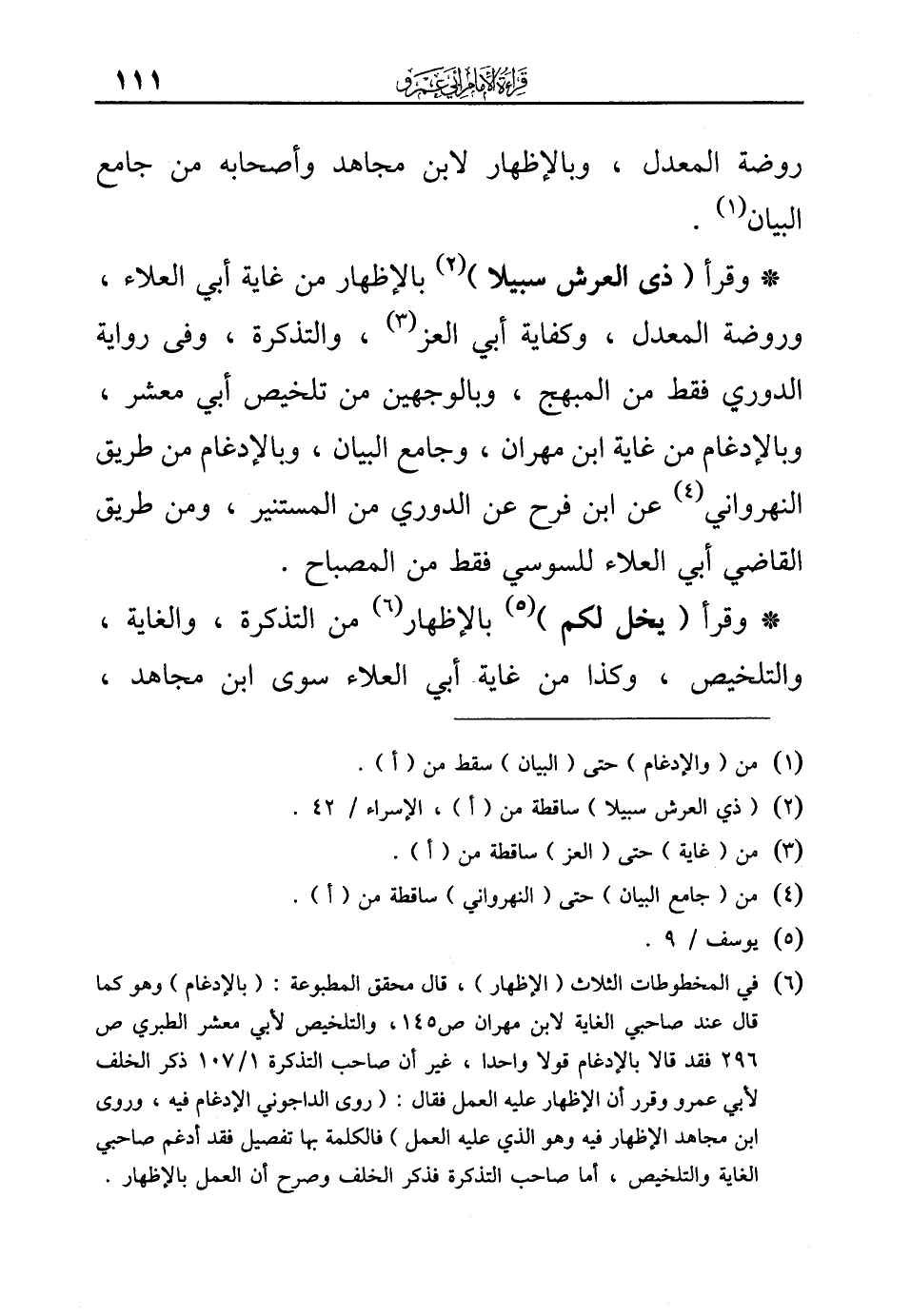 *وقرأ {(ذِي الْعَرْشِ سَبِيلاً)} (¬2) بالإظهار من غاية أبي العلاء، وروضة المعدل، وكفاية أبي العز (¬3)، والتذكرة، وفى رواية الدوري فقط من المبهج، وبالوجهين من تلخيص أبي معشر، وبالإدغام من غاية ابن مهران، وجامع البيان، وبالإدغام من طريق النهرواني (¬4) عن ابن فرح عن الدوري من المستنير، ومن طريق القاضي أبي العلاء للسوسي فقط من المصباح.