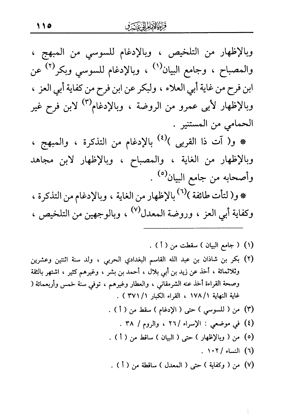 (¬2) بكر بن شاذان بن عبد الله القاسم البغدادي الحربي، ولد سنة اثنتين وعشرين وثلاثمائة، أخذ عن زيد بن أبي بلال، أحمد بن بشر، وغيرهم كثير، اشتهر بالثقة وصحة القراءة أخذ عنه الشرمقاني، والعطار وغيرهم، توفي سنة خمس وأربعمائة (غاية النهاية 1/ 178، القراء الكبار 1/ 371).