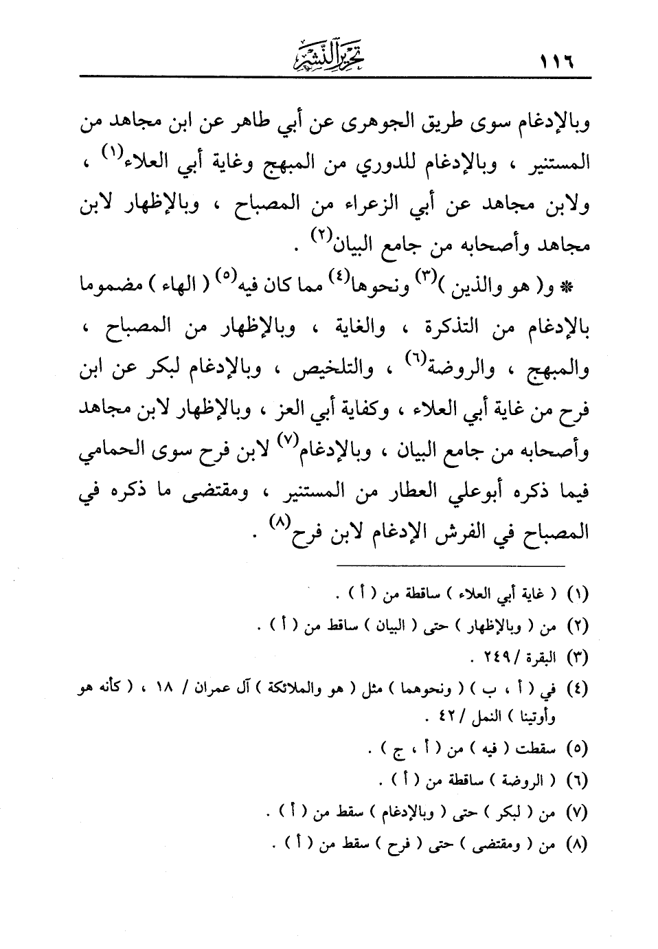 *و {(هُوَ وَالَّذِينَ)} (¬3) ونحوها (¬4) مما كان فيه (¬5) (الهاء) مضموما بالإدغام من التذكرة، والغاية، وبالإظهار من المصباح، والمبهج، والروضة (¬6)، والتلخيص، وبالإدغام لبكر عن ابن فرح من غاية أبي العلاء، وكفاية أبي العز، وبالإظهار لابن مجاهد وأصحابه من جامع البيان، وبالإدغام (¬7) لابن فرح سوى الحمامي فيما ذكره أبو علي العطار من المستنير، ومقتضى ما ذكره في المصباح في الفرش الإدغام لابن فرح (¬8).