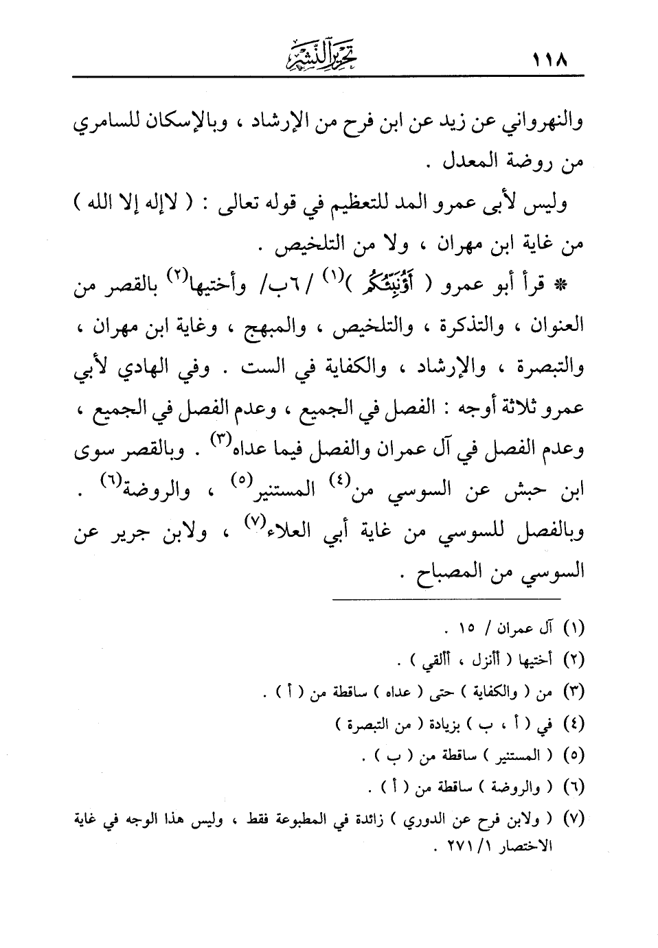 * قرأ أبو عمرو (أؤنبّئكم) (¬1) /6 ب/وأختيها (¬2) بالقصر من العنوان، والتذكرة، والتلخيص، والمبهج، وغاية ابن مهران، والتبصرة، والإرشاد، والكفاية في الست. وفي الهادي لأبي عمرو ثلاثة أوجه: الفصل في الجميع، وعدم الفصل في الجميع، وعدم الفصل في آل عمران والفصل فيما عداه (¬3). وبالقصر سوى ابن حبش عن السوسي من (¬4) المستنير (¬5)، والروضة (¬6).