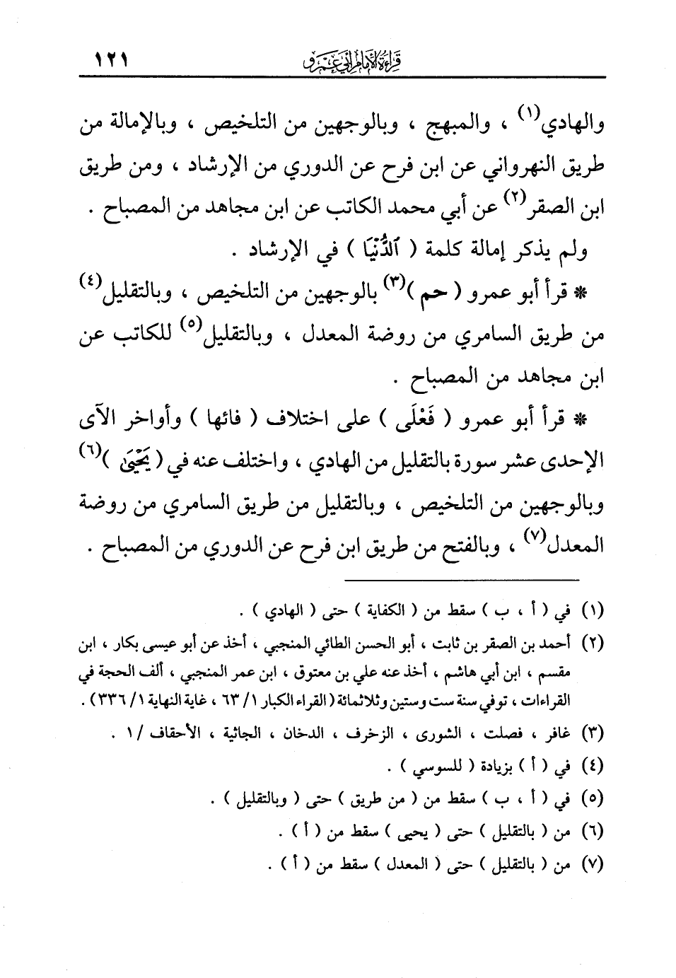 (¬2) أحمد بن الصقر بن ثابت، أبو الحسن الطائي المنجبي، أخذ عن أبو عيسى بكار، ابن مقسم، ابن أبي هاشم، أخذ عنه علي بن معتوق، ابن عمر المنجبي، ألف الحجة في القراءات، توفي سنة ست وستين وثلاثمائة (القراء الكبار 1/ 63، غاية النهاية 1/ 336).
