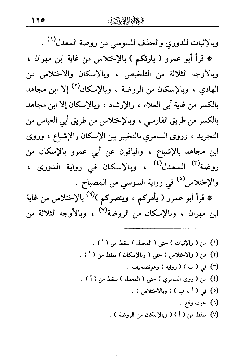 * قرأ أبو عمرو (بارئكم) بالإختلاس من غاية ابن مهران، وبالأوجه الثلاثة من التلخيص، وبالإسكان والاختلاس من الهادي، وبالإسكان من الروضة، وبالإسكان (¬2) إلا ابن مجاهد بالكسر من غاية أبي العلاء، والإرشاد، وبالإسكان إلا ابن مجاهد بالكسر من طريق الفارسي، وبالإختلاس من طريق أبي العباس من التجريد، وروى السامري بالتخيير بين الإسكان والإشباع، وروى ابن مجاهد بالإشباع، والباقون عن أبي عمرو بالإسكان من روضة (¬3) المعدل (¬4)، وبالإسكان في رواية الدوري، والإختلاس (¬5) في رواية السوسي من المصباح.