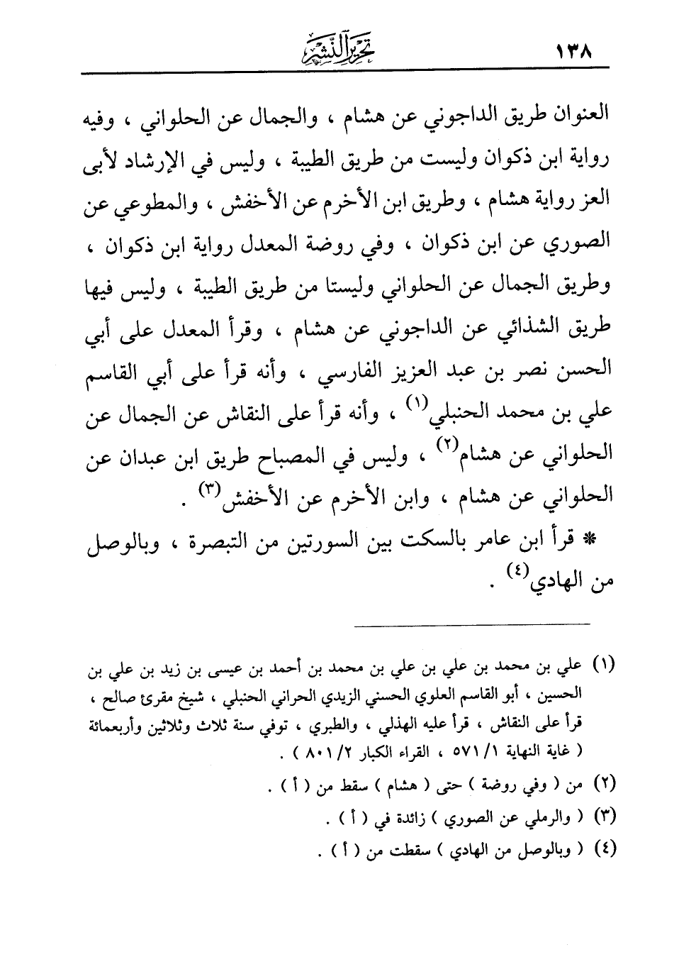 كتاب اتحاف البررة بما سكت عنه نشر العشرة = تحرير النشر