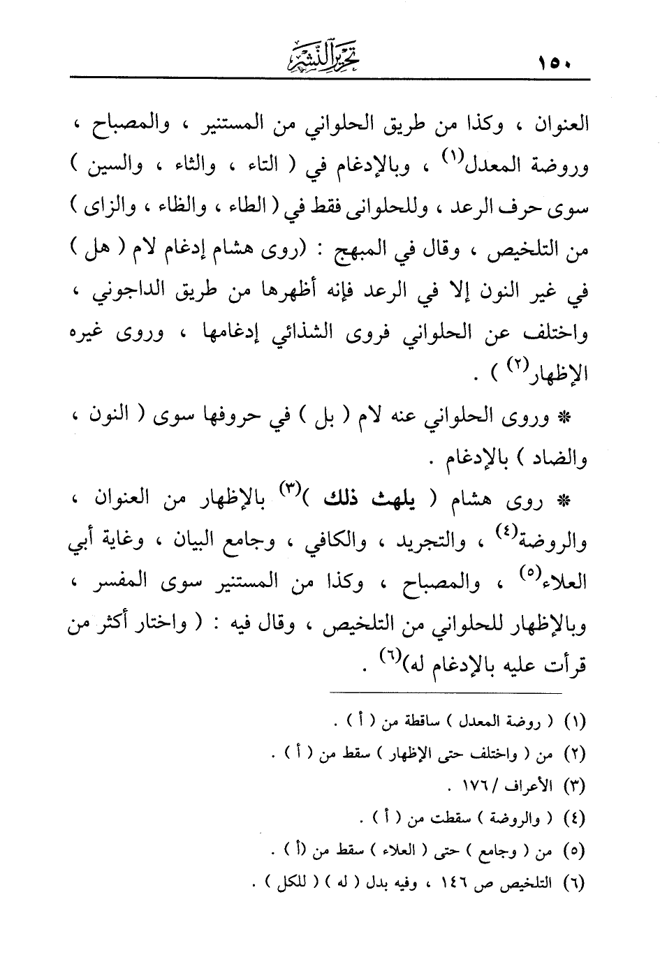 * روى هشام {(يَلْهَثْ ذلِكَ)} (¬3) بالإظهار من العنوان، والروضة (¬4)، والتجريد، والكافي، وجامع البيان، وغاية أبي العلاء (¬5)، والمصباح، وكذا من المستنير سوى المفسر، وبالإظهار للحلواني من التلخيص، وقال فيه: (واختار أكثر من قرأت عليه بالإدغام له) (¬6).