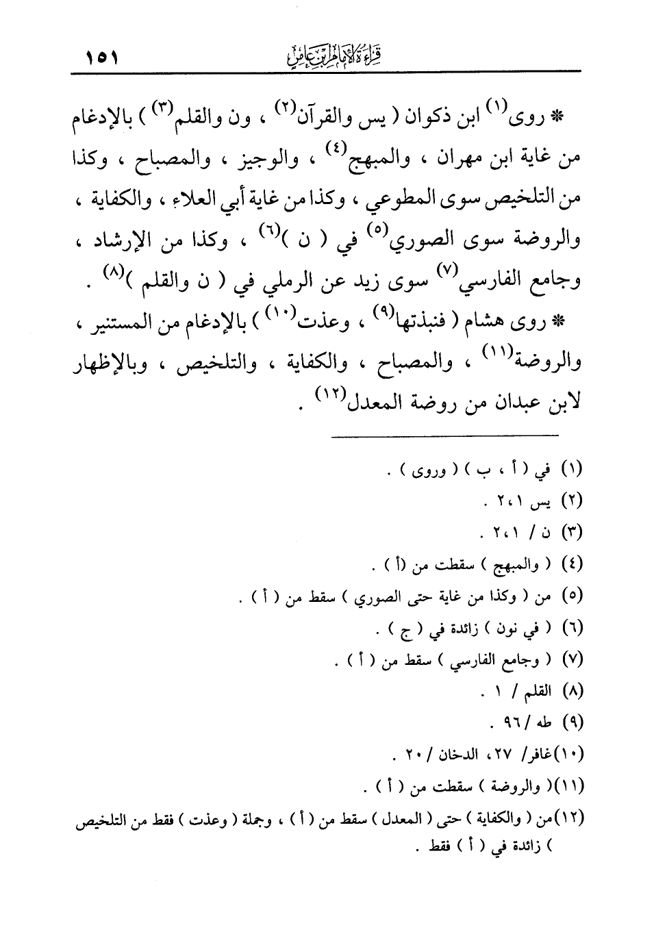 * روى (¬1) ابن ذكوان ({يس وَالْقُرْآنِ} (¬2)، و {ن وَالْقَلَمِ} (¬3)) بالإدغام من غاية ابن مهران، والمبهج (¬4)، والوجيز، والمصباح، وكذا من التلخيص سوى المطوعي، وكذا من غاية أبي العلاء، والكفاية، والروضة سوى الصوري (¬5) في (ن) (¬6)، وكذا من الإرشاد، وجامع الفارسي (¬7) سوى زيد عن الرملي في {(ن وَالْقَلَمِ)} (¬8).