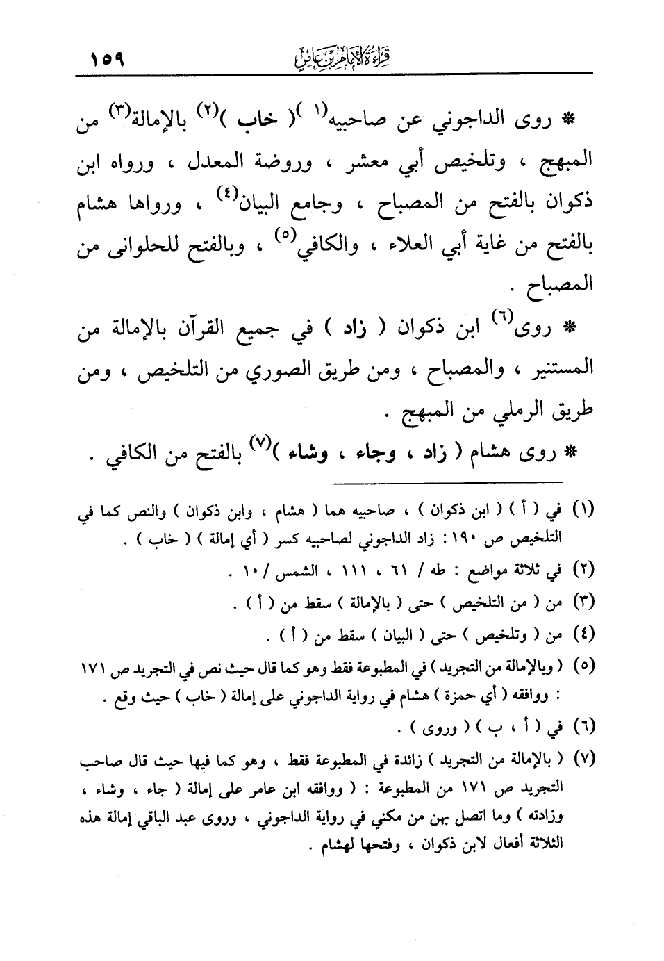 (¬7) (بالإمالة من التجريد) زائدة في المطبوعة فقط، وهو كما فيها حيث قال صاحب التجريد ص 171 من المطبوعة: (ووافقه ابن عامر على إمالة (جاء، وشاء، وزادته) وما اتصل بهن من مكني في رواية الداجوني، وروى عبد الباقي إمالة هذه الثلاثة أفعال لابن ذكوان، وفتحها لهشام.