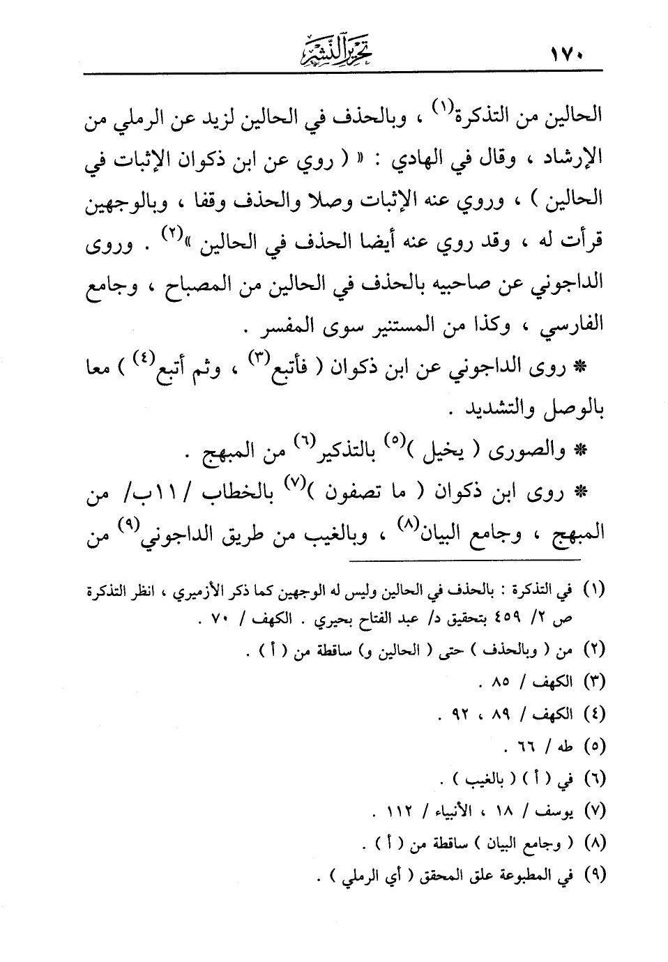 (¬1) في التذكرة: بالحذف في الحالين وليس له الوجهين كما ذكر الأزميري، انظر التذكرة ص 2/ 459 بتحقيق د/عبد الفتاح بحيري. الكهف/70.