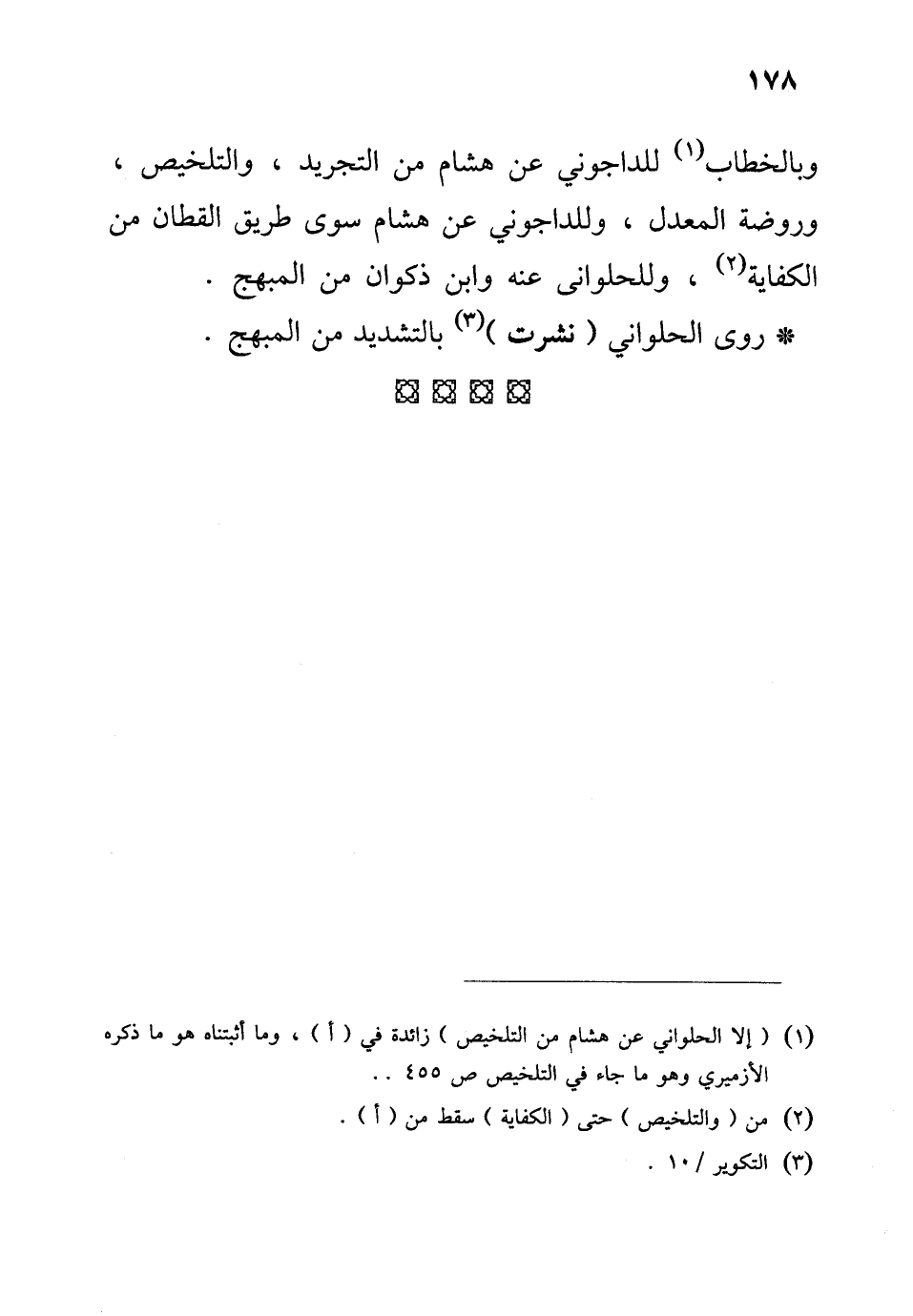 (¬1) (إلا الحلواني عن هشام من التلخيص) زائدة في (أ)، وما أثبتناه هو ما ذكره الأزميري وهو ما جاء في التلخيص ص 455. .