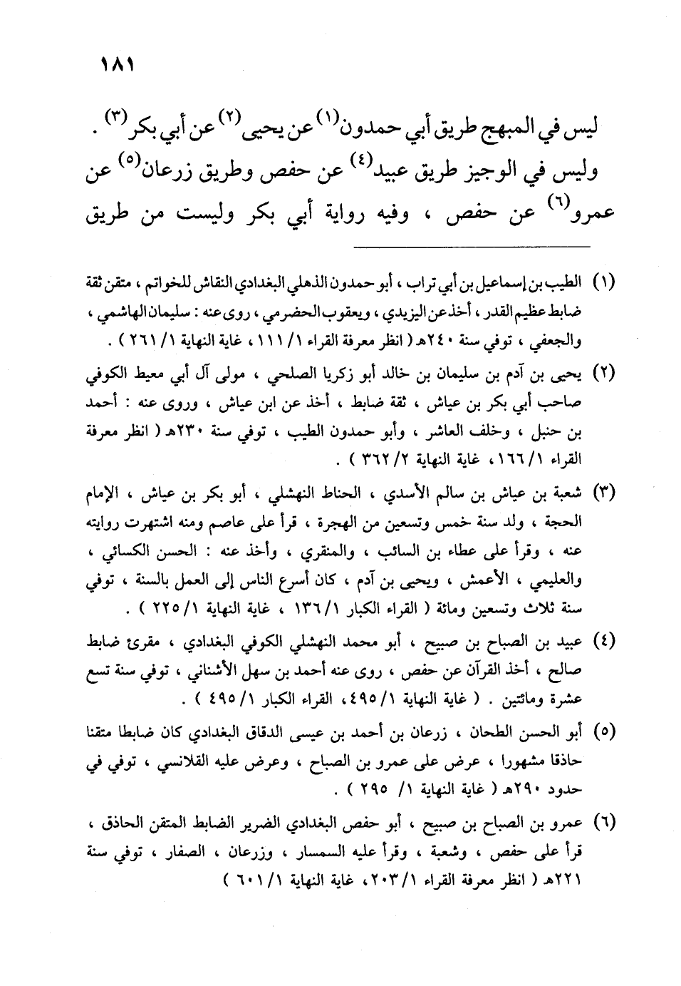 (¬6) عمرو بن الصباح بن صبيح، أبو حفص البغدادي الضرير الضابط المتقن الحاذق، قرأ على حفص، وشعبة، وقرأ عليه السمسار، وزرعان، الصفار، توفي سنة 221 هـ (انظر معرفة القراء 1/ 203، غاية النهاية 1/ 601)