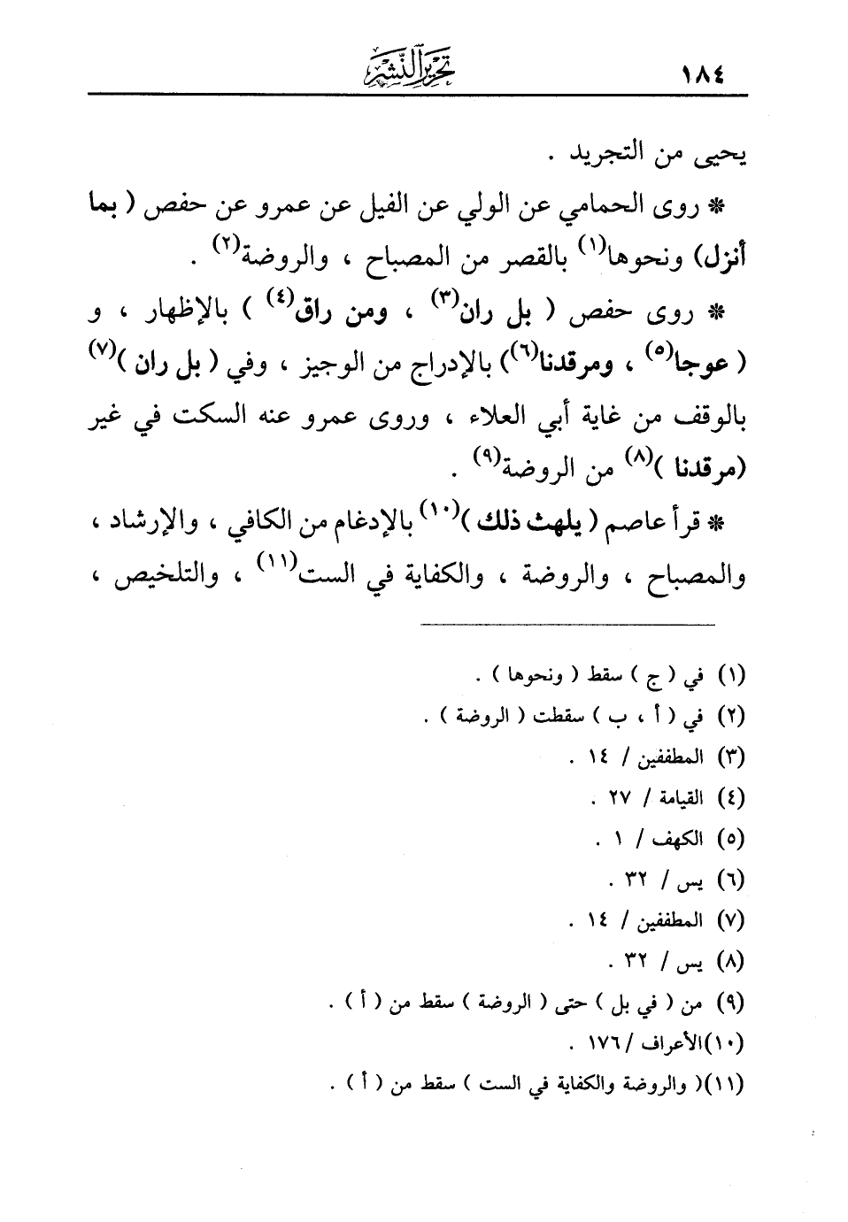* روى حفص ({بَلْ رانَ} (¬3)، و {مَنْ راقٍ} (¬4)) بالإظهار، و ({عِوَجاً} (¬5)، و {مَرْقَدِنا} (¬6)) بالإدراج من الوجيز، وفي {(بَلْ رانَ)} (¬7) بالوقف من غاية أبي العلاء، وروى عمرو عنه السكت في غير {(مَرْقَدِنا)} (¬8) من الروضة (¬9).