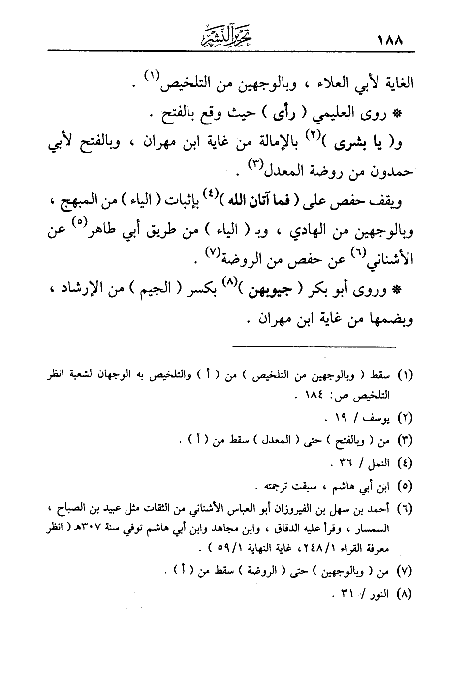 (¬6) أحمد بن سهل بن الفيروزان أبو العباس الأشناني من الثقات مثل عبيد بن الصباح، السمسار، وقرأ عليه الدقاق، وابن مجاهد وابن أبي هاشم توفي سنة 307 هـ (انظر معرفة القراء 1/ 248، غاية النهاية 1/ 59).