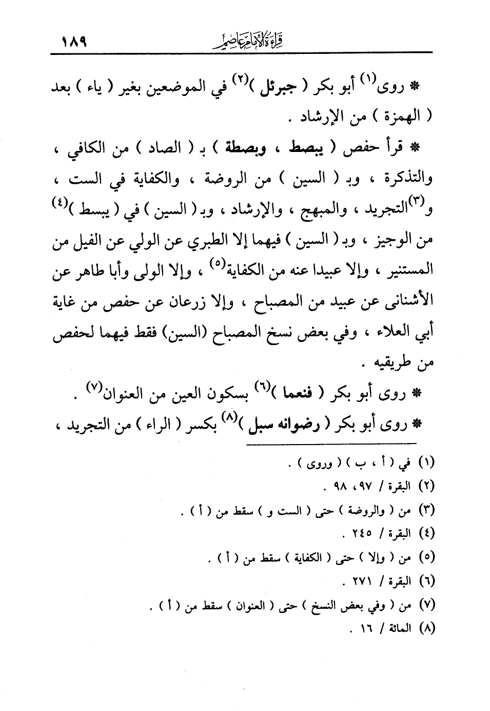 *روى أبو بكر {(رِضْوانَهُ سُبُلَ)} (¬8) بكسر (الراء) من التجريد،