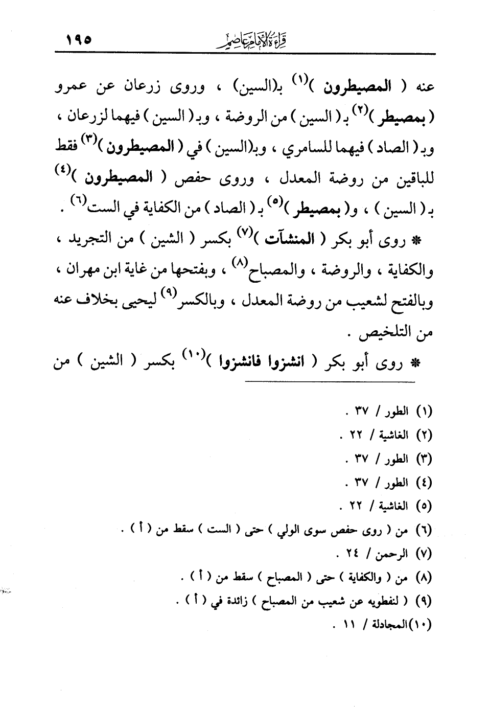 عنه {(الْمُصَيْطِرُونَ)} (¬1) ب (السين)، وروى زرعان عن عمرو {(بِمُصَيْطِرٍ)} (¬2) ب (السين) من الروضة، وب (السين) فيهما لزرعان، وب (الصاد) فيهما للسامري، وب (السين) في {(الْمُصَيْطِرُونَ)} (¬3) فقط للباقين من روضة المعدل، وروى حفص {(الْمُصَيْطِرُونَ)} (¬4) ب (السين)، و {(بِمُصَيْطِرٍ)} (¬5) ب (الصاد) من الكفاية في الست (¬6).