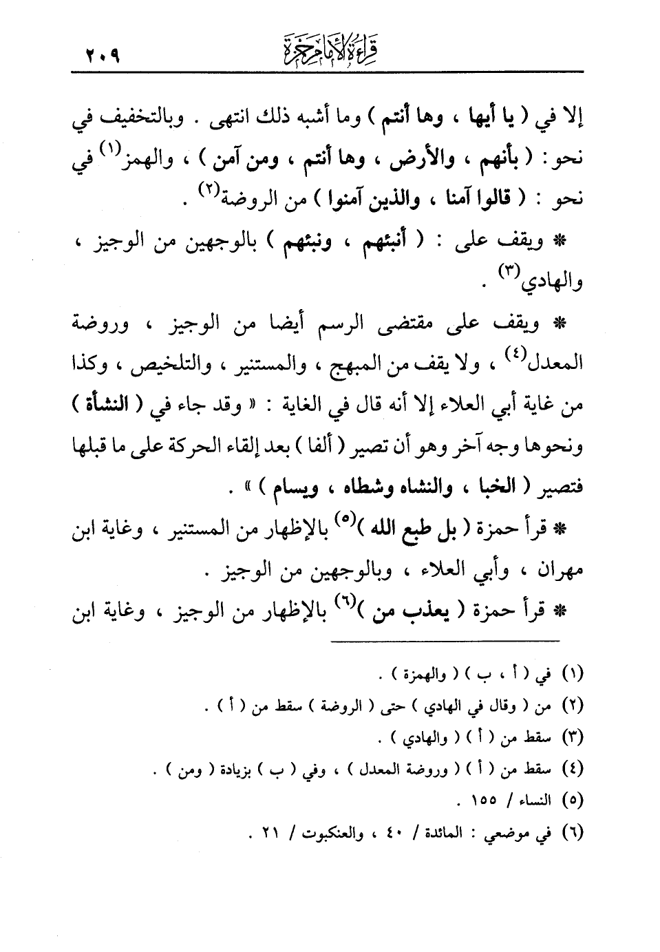 *ويقف على مقتضى الرسم أيضا من الوجيز، وروضة المعدل (¬4)، ولا يقف من المبهج، والمستنير، والتلخيص، وكذا من غاية أبي العلاء إلا أنه قال في الغاية: «وقد جاء في (النشأة) ونحوها وجه آخر وهو أن تصير (ألفا) بعد إلقاء الحركة على ما قبلها فتصير (الخبا، والنشاه وشطاه، ويسام)».