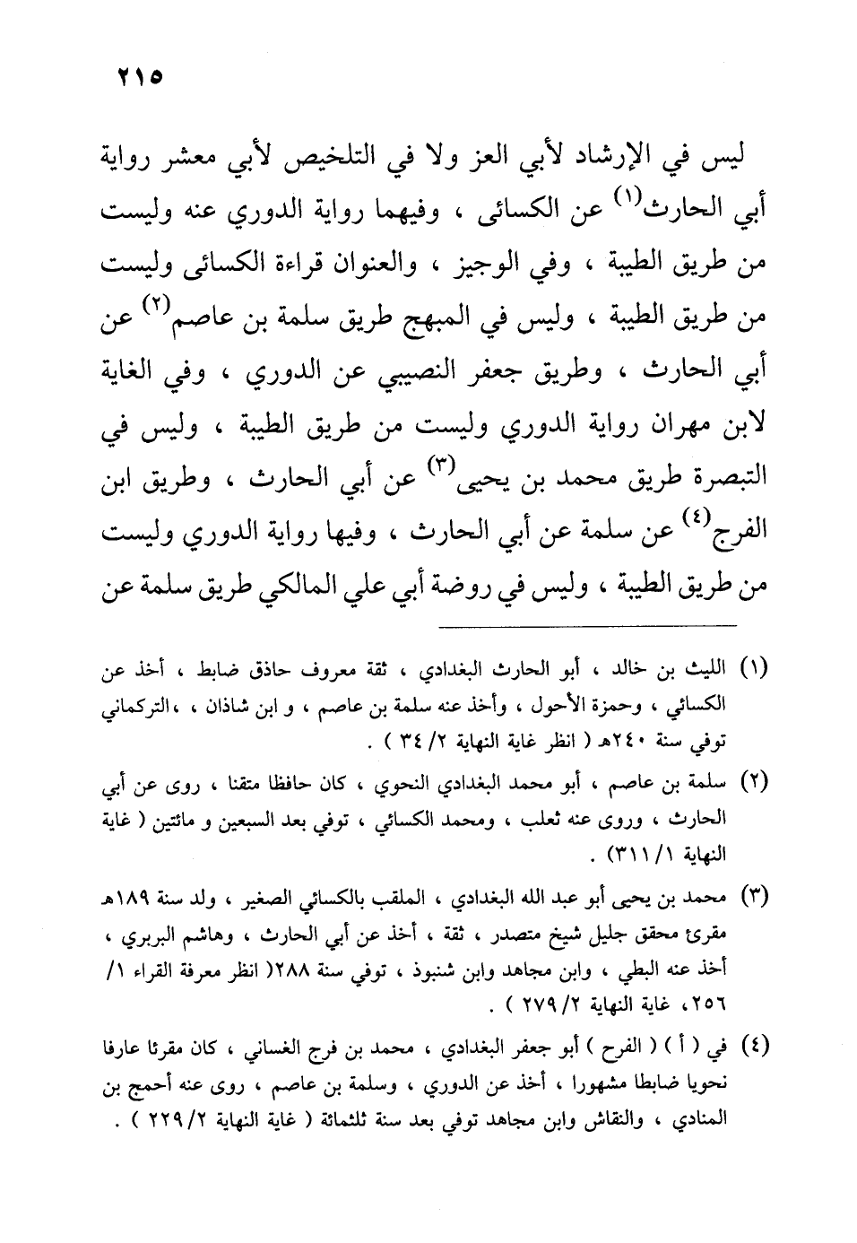(¬1) الليث بن خالد، أبو الحارث البغدادي، ثقة معروف حاذق ضابط، أخذ عن الكسائي، وحمزة الأحول، وأخذ عنه سلمة بن عاصم، وابن شاذان،، التركماني توفي سنة 240 هـ (انظر غاية النهاية 2/ 34).