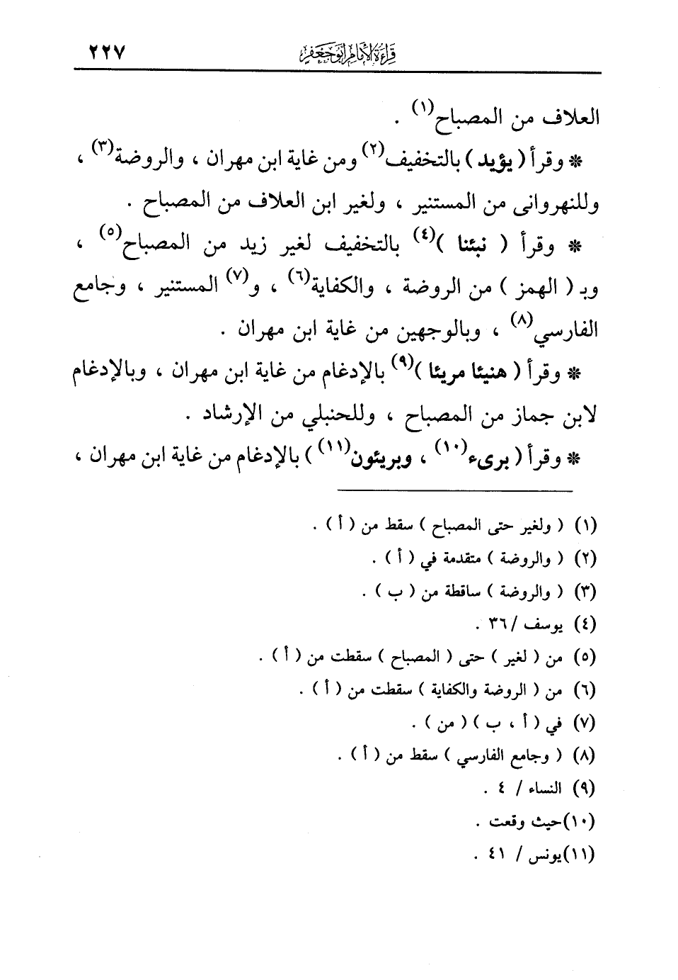 * وقرأ {(هَنِيئاً مَرِيئاً)} (¬9) بالإدغام من غاية ابن مهران، وبالإدغام لابن جماز من المصباح، وللحنبلي من الإرشاد.