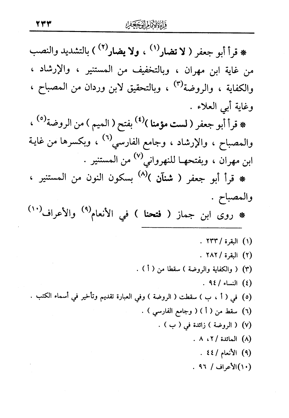 * قرأ أبو جعفر ({لا تُضَارَّ} (¬1)، و {لا يُضَارَّ} (¬2)) بالتشديد والنصب من غاية ابن مهران، وبالتخفيف من المستنير، والإرشاد، والكفاية، والروضة (¬3)، وبالتحقيق لابن وردان من المصباح، وغاية أبي العلاء.