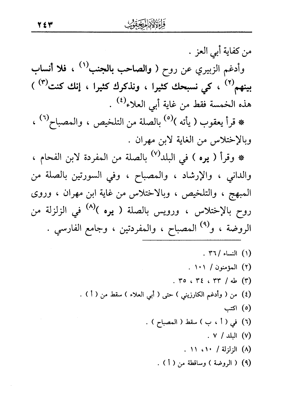 وأدغم الزبيري عن روح ({وَالصّاحِبِ بِالْجَنْبِ} (¬1)، {فَلا أَنْسابَ بَيْنَهُمْ} (¬2)، {كَيْ نُسَبِّحَكَ كَثِيراً}، و {نَذْكُرَكَ كَثِيراً}، {إِنَّكَ كُنْتَ} (¬3)) هذه الخمسة فقط من غاية أبي العلاء (¬4).