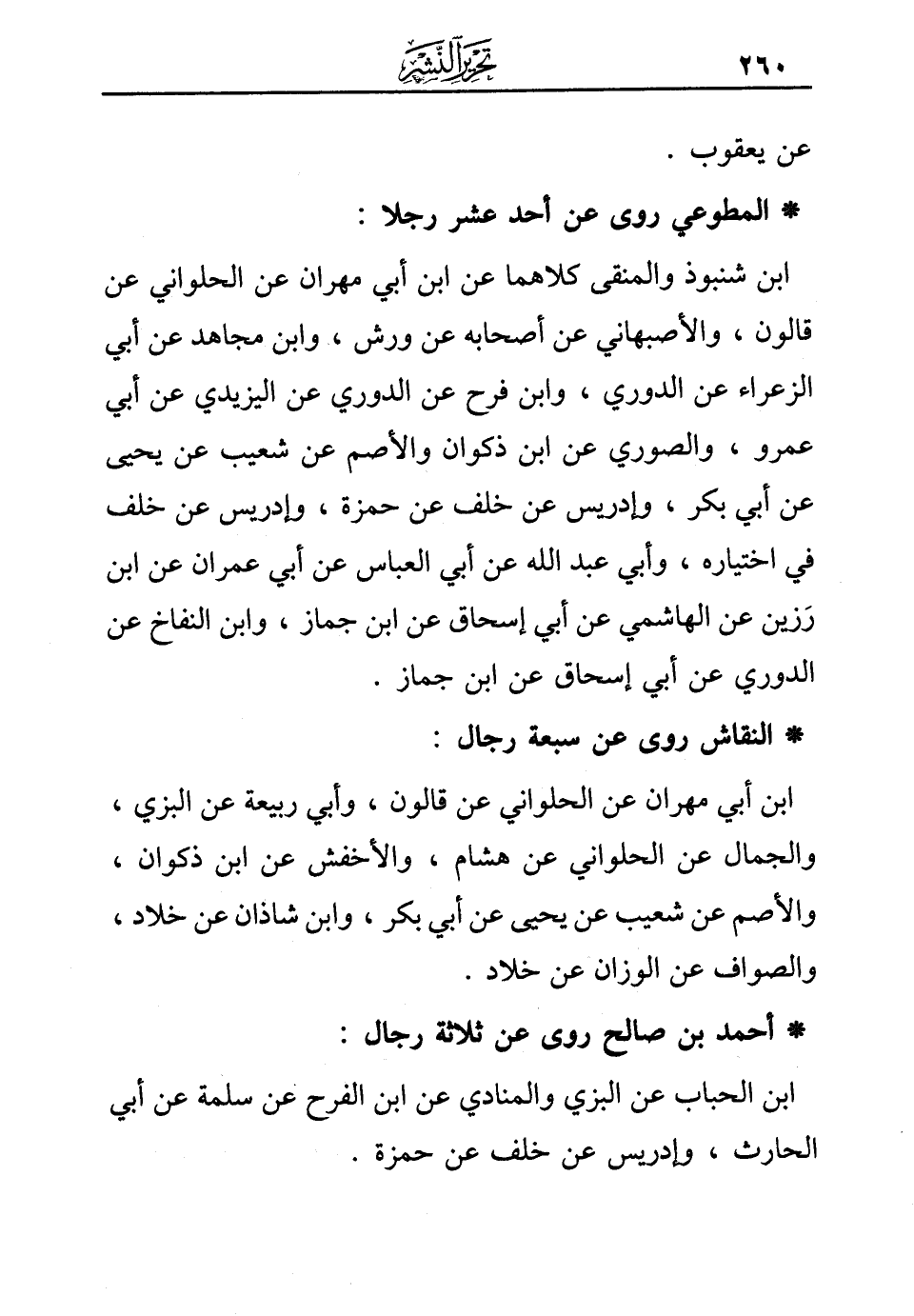 ابن شنبوذ والمنقى كلاهما عن ابن أبي مهران عن الحلواني عن قالون، والأصبهاني عن أصحابه عن ورش، وابن مجاهد عن أبي الزعراء عن الدوري، وابن فرح عن الدوري عن اليزيدي عن أبي عمرو، والصوري عن ابن ذكوان والأصم عن شعيب عن يحيى عن أبي بكر، وإدريس عن خلف عن حمزة، وإدريس عن خلف في اختياره، وأبي عبد الله عن أبي العباس عن أبي عمران عن ابن رزين عن الهاشمي عن أبي إسحاق عن ابن جماز، وابن النفاخ عن الدوري عن أبي إسحاق عن ابن جماز.