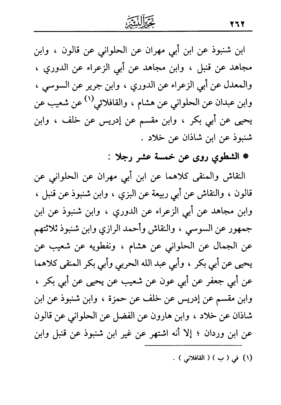 ابن شنبوذ عن ابن أبي مهران عن الحلواني عن قالون، وابن مجاهد عن قنبل، وابن مجاهد عن أبي الزعراء عن الدوري، والمعدل عن أبي الزعراء عن الدوري، وابن جرير عن السوسي، وابن عبدان عن الحلواني عن هشام، والقافلائي (¬1) عن شعيب عن يحيى عن أبي بكر، وابن مقسم عن إدريس عن خلف، وابن شنبوذ عن ابن شاذان عن خلاد.
