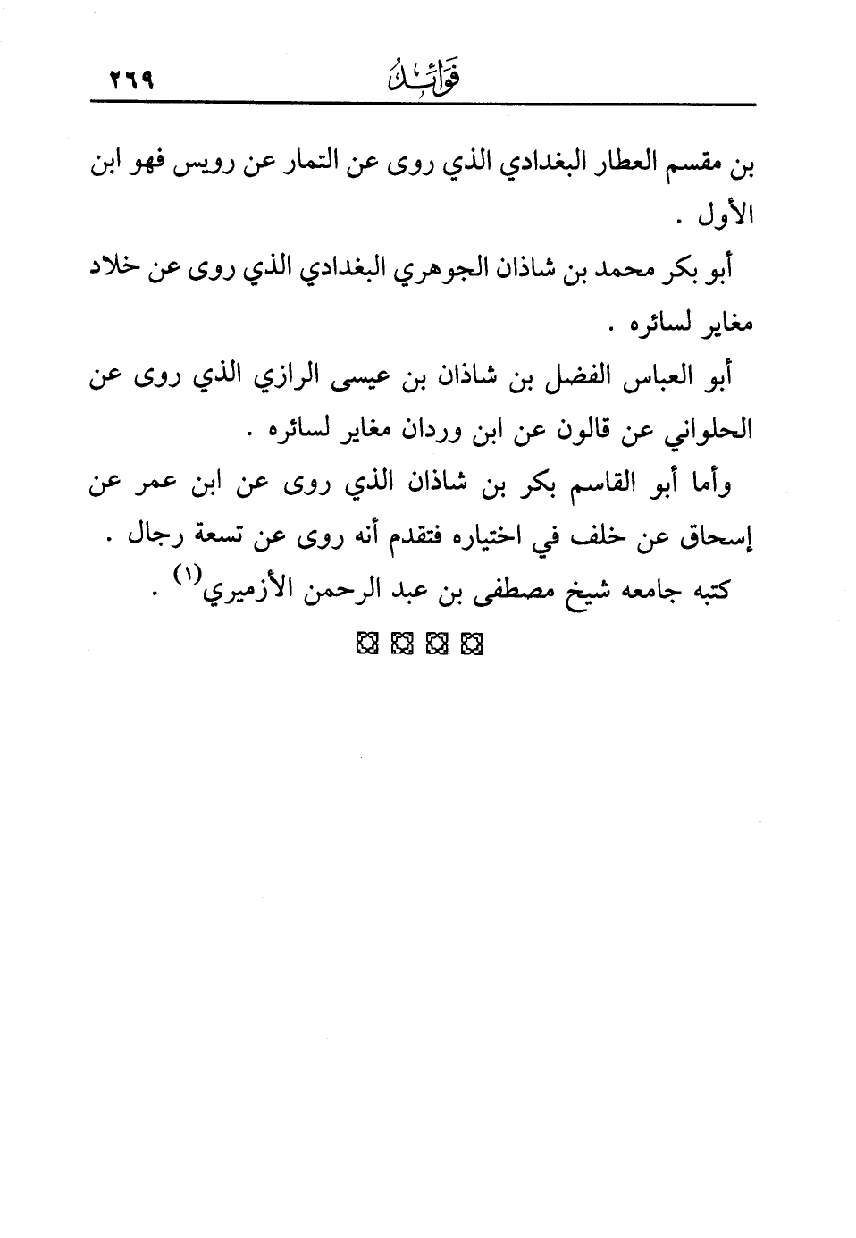 وأما أبو القاسم بكر بن شاذان الذي روى عن ابن عمر عن إسحاق عن خلف في اختياره فتقدم أنه روى عن تسعة رجال.