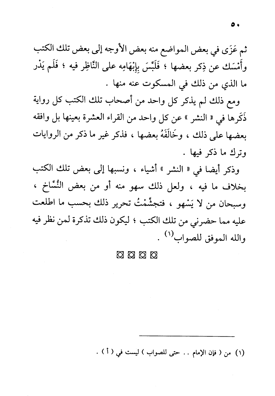 وذكر أيضا في «النشر» أشياء، ونسبها إلى بعض تلك الكتب بخلاف ما فيه، ولعل ذلك سهو منه أو من بعض النّسّاخ، وسبحان من لا يسهو، فتجشّمت تحرير ذلك بحسب ما اطلعت عليه مما حضرني من تلك الكتب؛ ليكون ذلك تذكرة لمن نظر فيه والله الموفق للصواب (¬1).